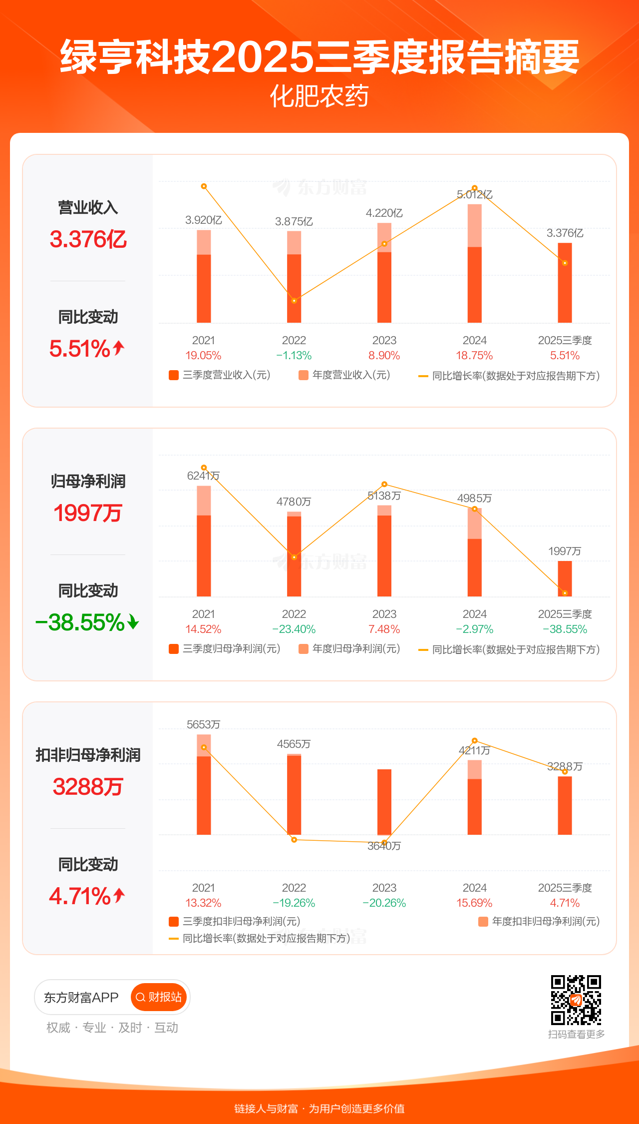 绿亨科技10月28日发布2025年三季报显示,公司前三季实现营业收入3.38亿元,同比增长5.51%;归母净利润1996.79万元,同比下滑38.55%;扣非归母净利润3288.42万元,同比增长4.71%。