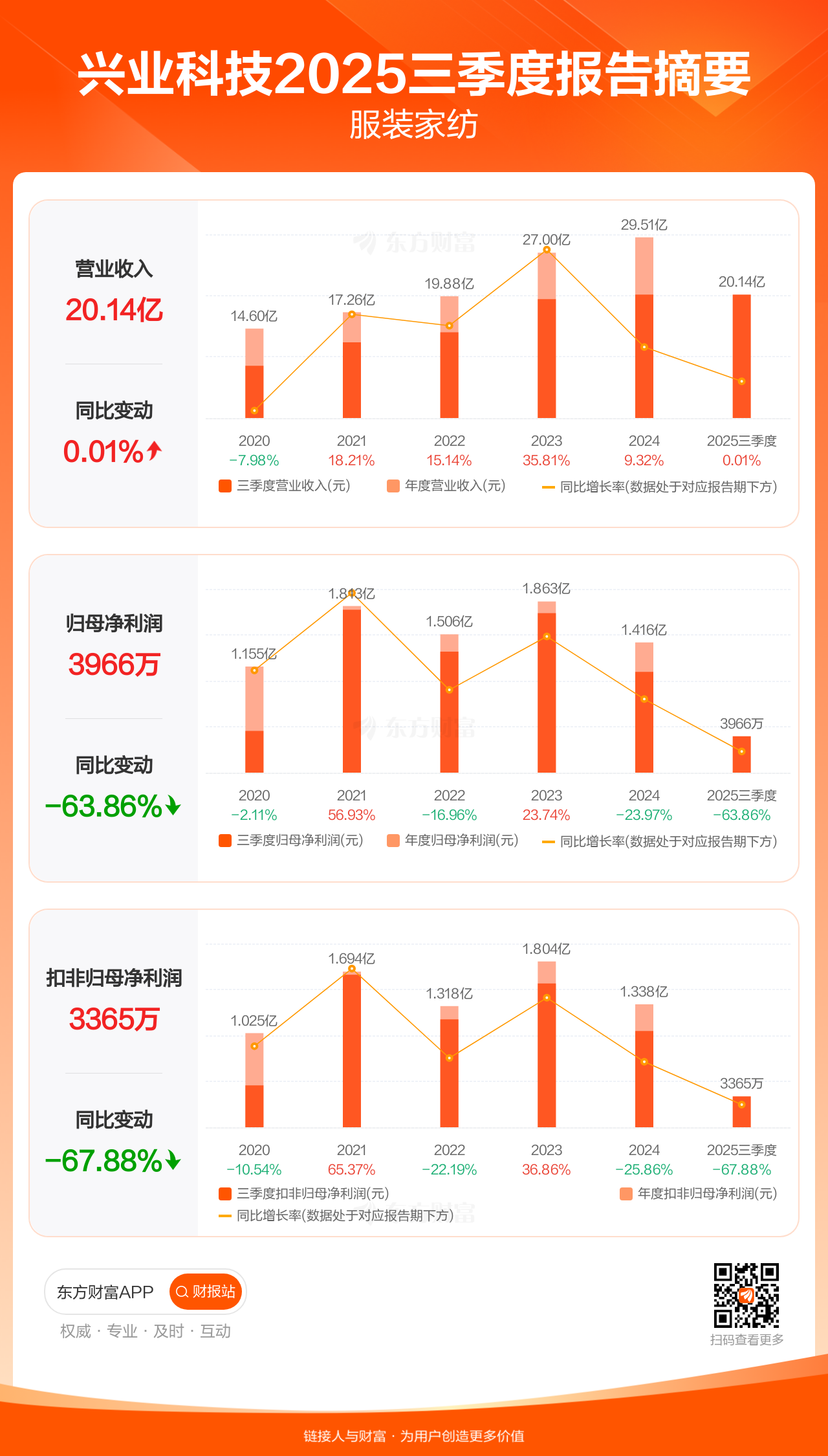 兴业科技10月29日发布2025年三季报显示,公司前三季实现营业收入20.14亿元,同比增长0.01%;归母净利润3965.58万元,同比下滑63.86%;扣非归母净利润3364.95万元,同比下滑67.88%。