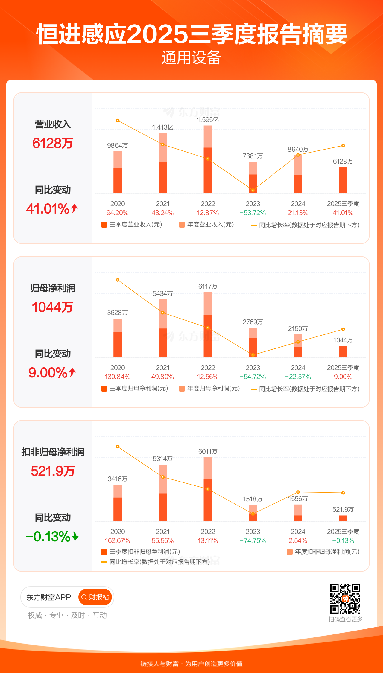 恒进感应10月28日发布2025年三季报显示,公司前三季实现营业收入6128.50万元,同比增长41.01%;归母净利润1044.50万元,同比增长9.00%;扣非归母净利润521.94万元,同比下滑0.13%。
