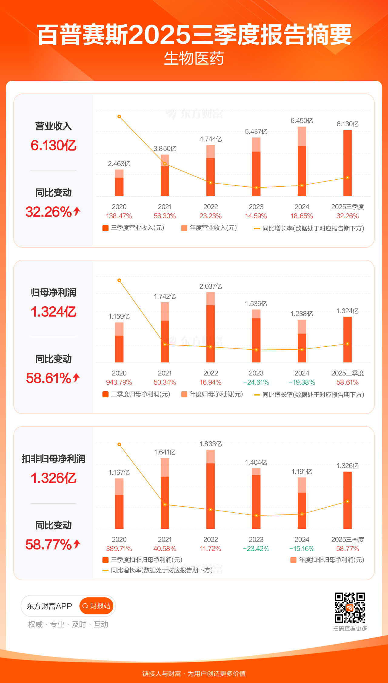 百普赛斯10月29日发布2025年三季报显示,公司前三季实现营业收入6.13亿元,同比增长32.26%;归母净利润1.32亿元,同比增长58.61%;扣非归母净利润1.33亿元,同比增长58.77%。