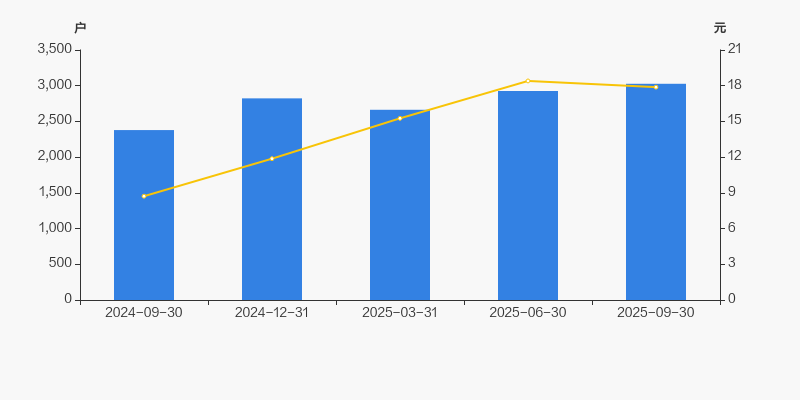截至2025年9月30日,公司最新总股本为8200.83万股,其中流通股本为2209.86万股。户均持有流通股数量由上期的7552股下降至7300股,户均流通市值13.05万元。
