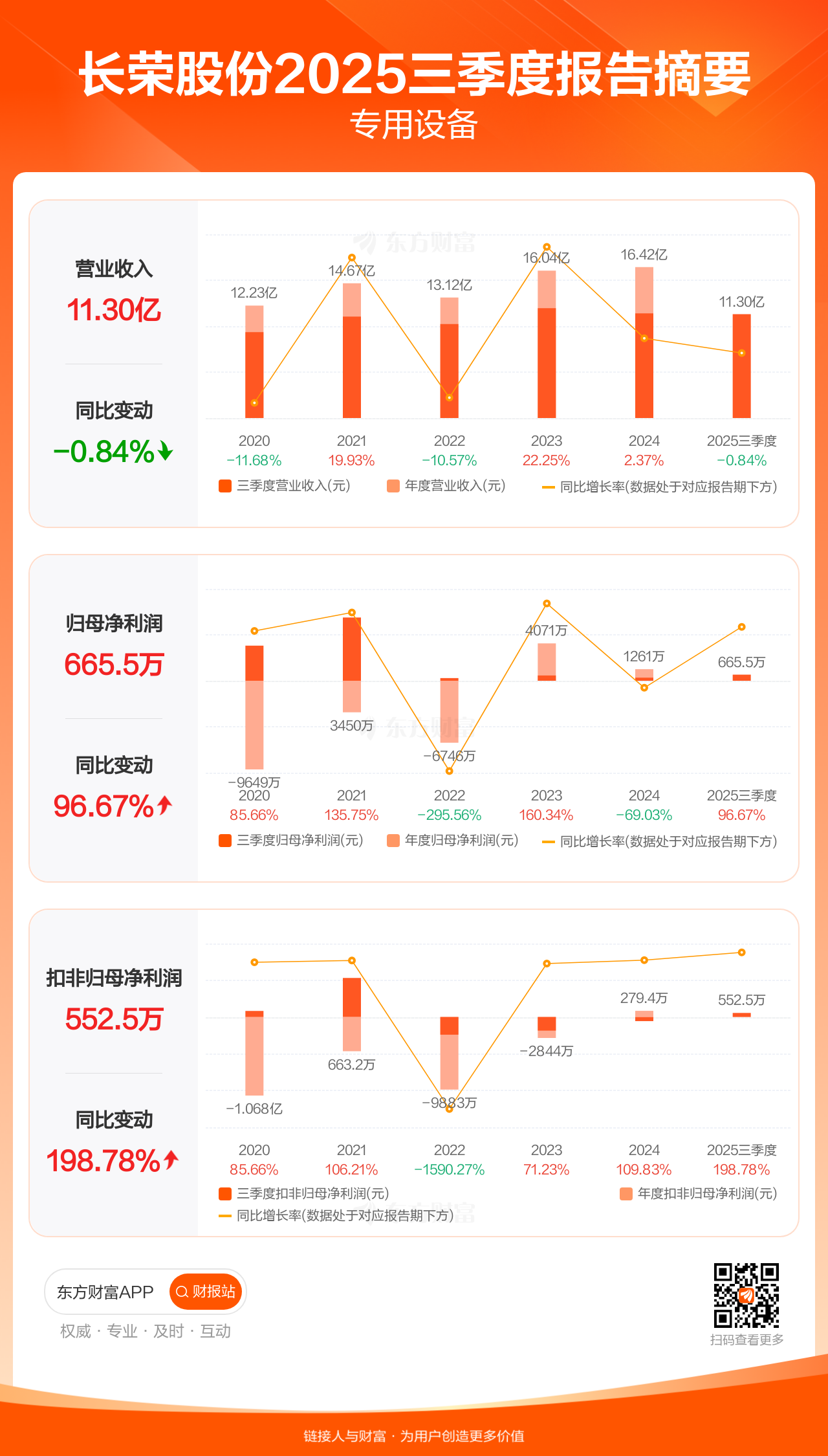 长荣股份10月29日发布2025年三季报显示,公司前三季实现营业收入11.30亿元,同比下滑0.84%;归母净利润665.51万元,同比增长96.67%;扣非归母净利润552.52万元,同比增长198.78%。