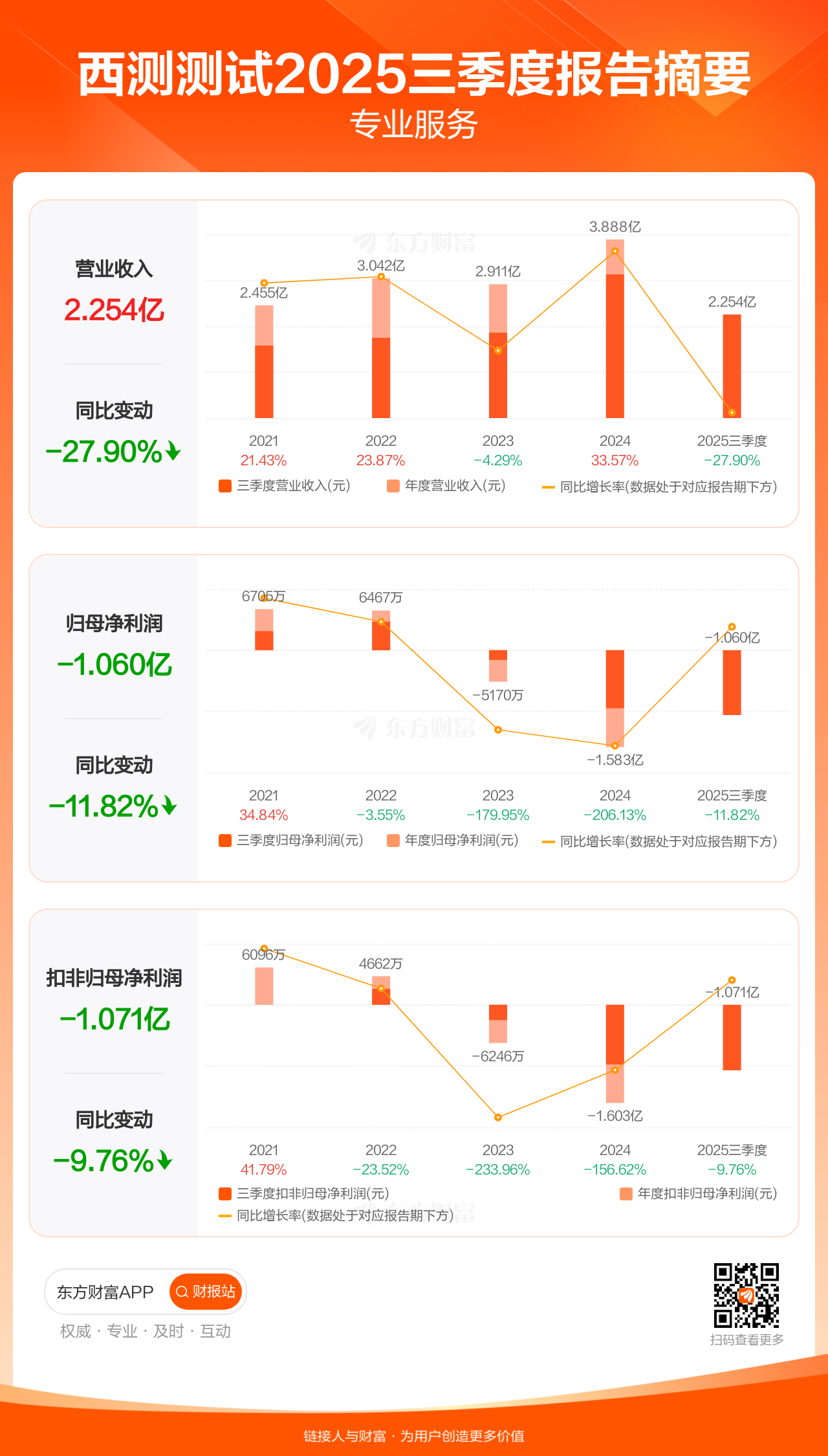 西测测试10月29日发布2025年三季报显示,公司前三季实现营业收入2.25亿元,同比下滑27.90%;归母净利润-1.06亿元;扣非归母净利润-1.07亿元。