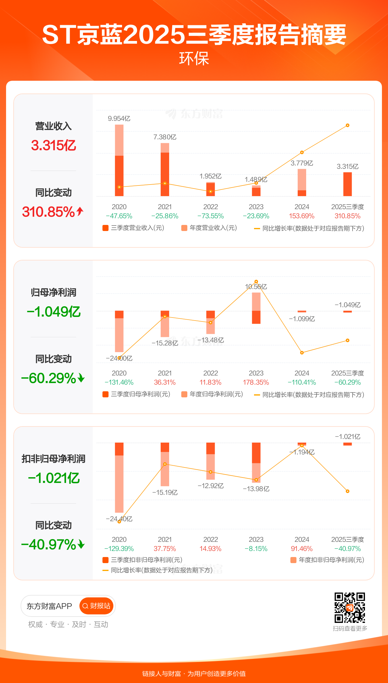 ST京蓝10月29日发布2025年三季报显示,公司前三季实现营业收入3.32亿元,同比增长310.85%;归母净利润-1.05亿元;扣非归母净利润-1.02亿元