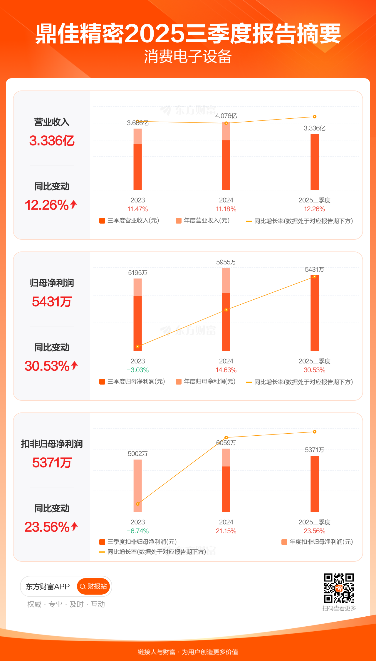 鼎佳精密10月28日发布2025年三季报显示,公司前三季实现营业收入3.34亿元,同比增长12.26%;归母净利润5431.03万元,同比增长30.53%;扣非归母净利润5370.80万元,同比增长23.56%。