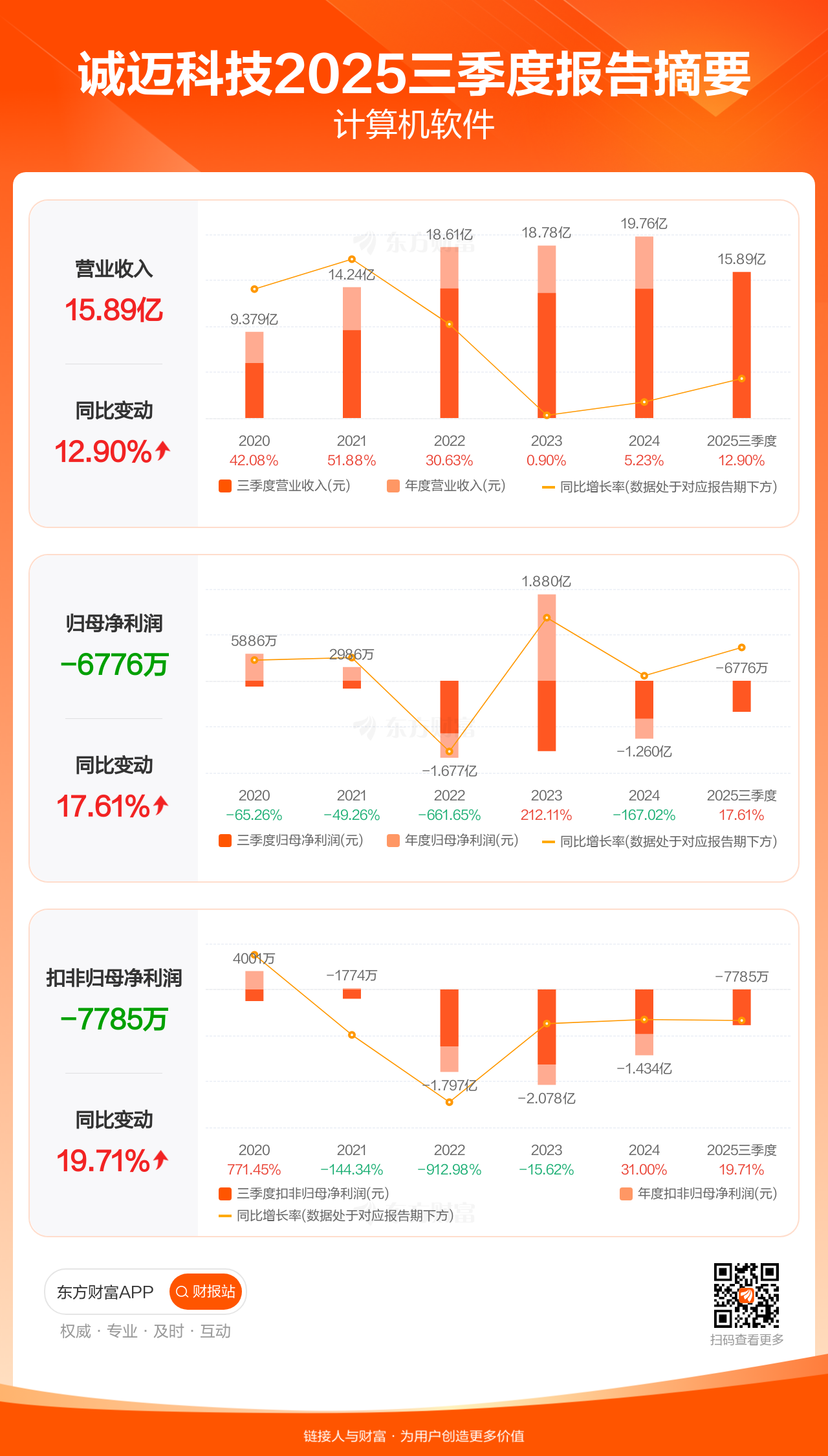 诚迈科技10月29日发布2025年三季报显示,公司前三季实现营业收入15.89亿元,同比增长12.90%;归母净利润-6776.25万元;扣非归母净利润-7785.39万元。