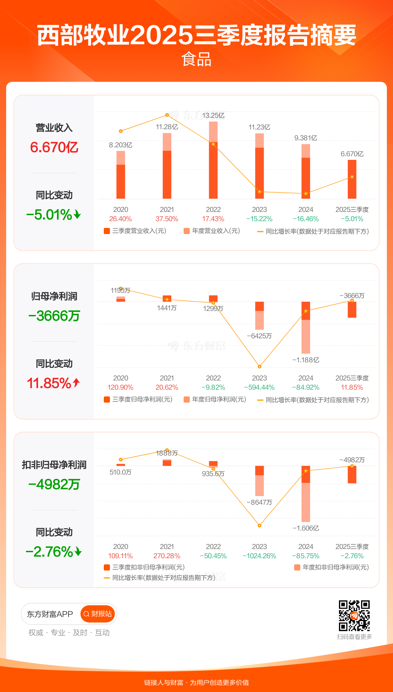 西部牧业10月29日发布2025年三季报显示,公司前三季实现营业收入6.67亿元,同比下滑5.01%;归母净利润-3665.81万元;扣非归母净利润-4982.40万元。