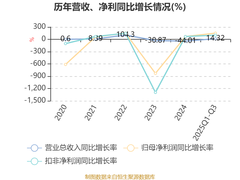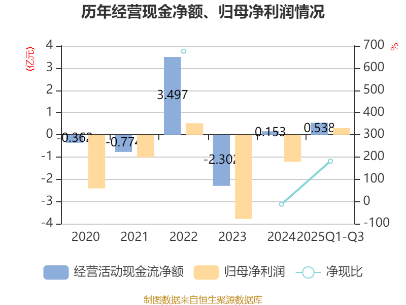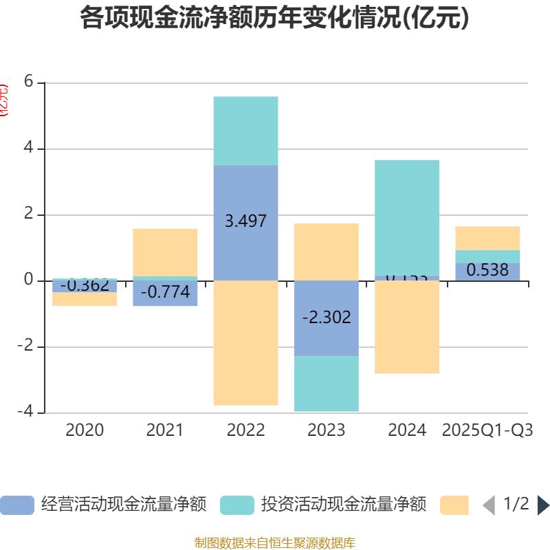 2025年前三季度,公司经营活动现金流净额为5376.83万元,同比增加8550.98万元;筹资活动现金流净额7116.24万元,同比增加2.53亿元;投资活动现金流净额3890.45万元,上年同期为3.48亿元。