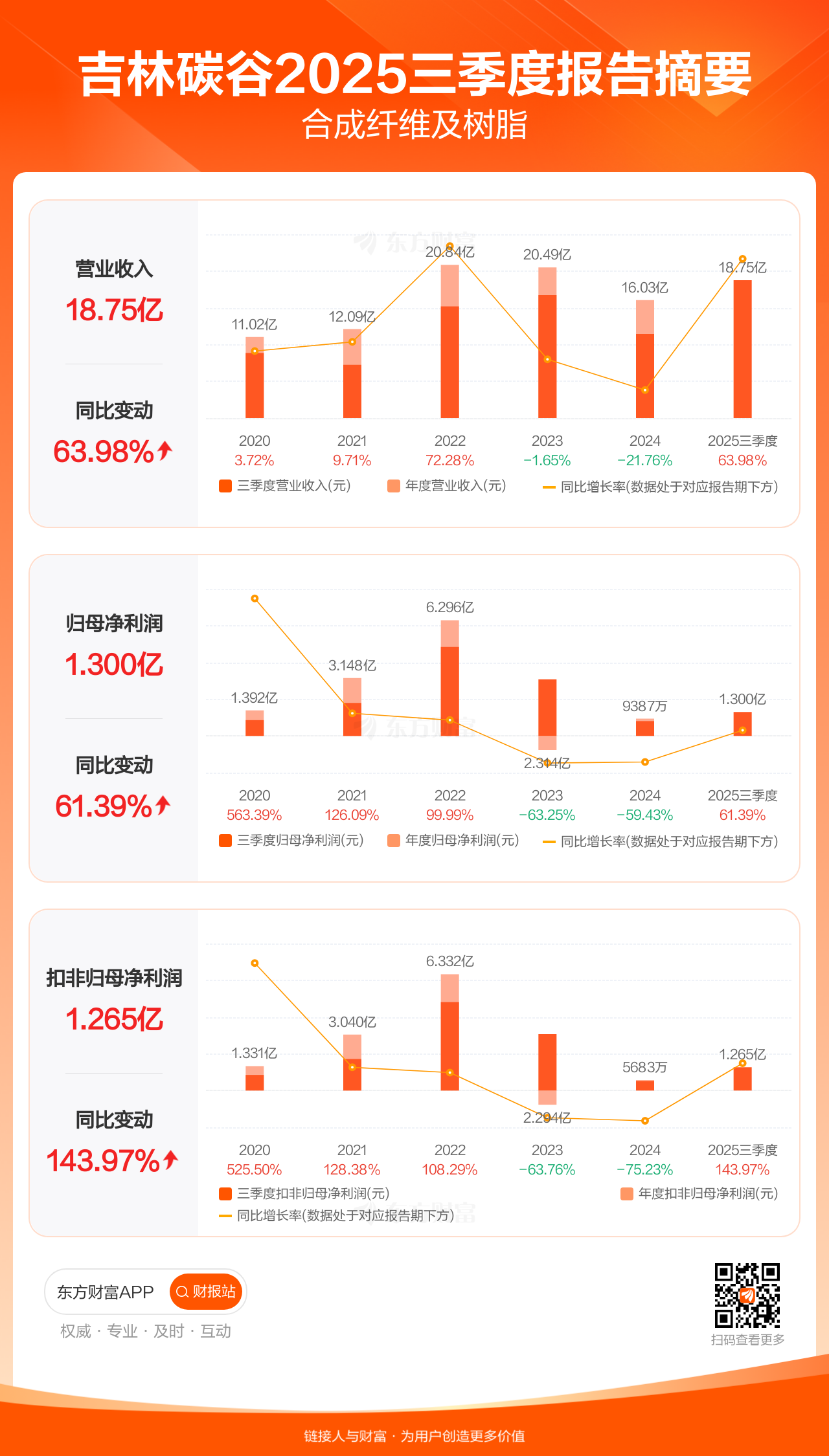 吉林碳谷10月28日发布2025年三季报显示,公司前三季实现营业收入18.75亿元,同比增长63.98%;归母净利润1.30亿元,同比增长61.39%;扣非归母净利润1.26亿元,同比增长143.97%。