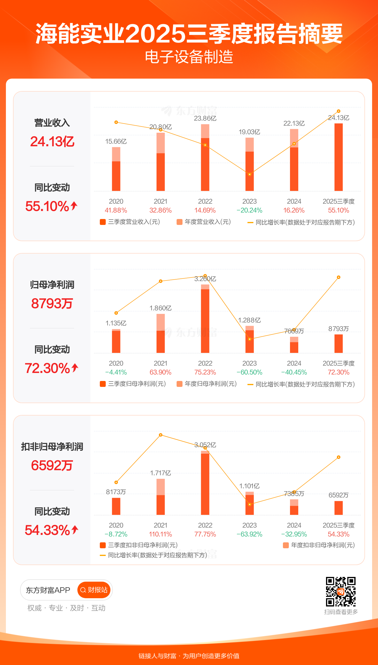 海能实业10月29日发布2025年三季报显示,公司前三季实现营业收入24.13亿元,同比增长55.10%;归母净利润8792.85万元,同比增长72.30%;扣非归母净利润6592.37万元,同比增长54.33%。