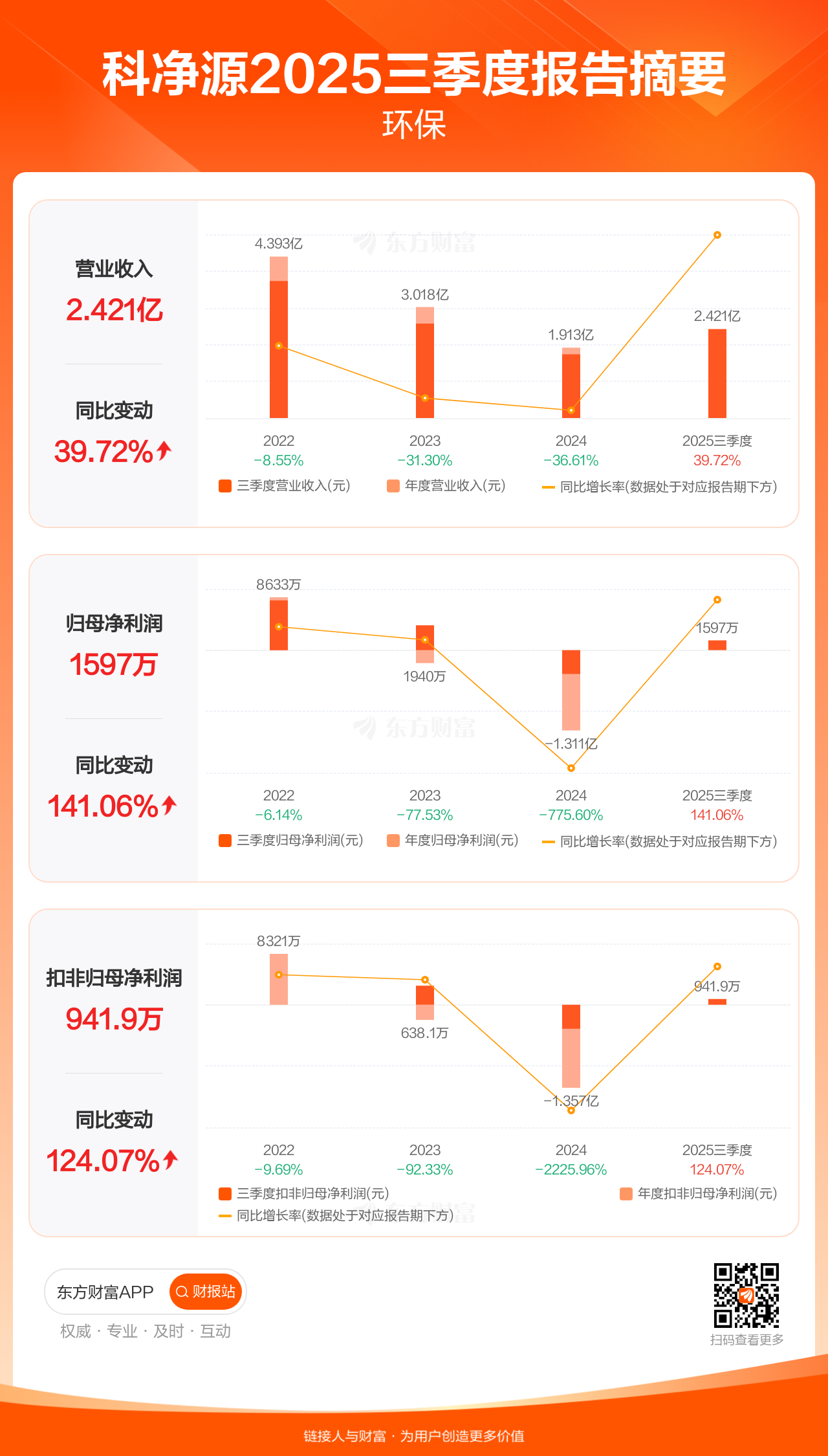 科净源10月29日发布2025年三季报显示,公司前三季实现营业收入2.42亿元,同比增长39.72%;归母净利润1597.18万元,同比增长141.06%;扣非归母净利润941.93万元,同比增长124.07%