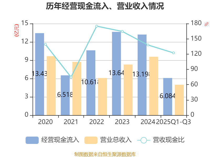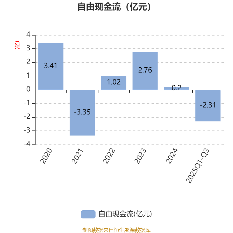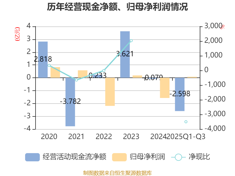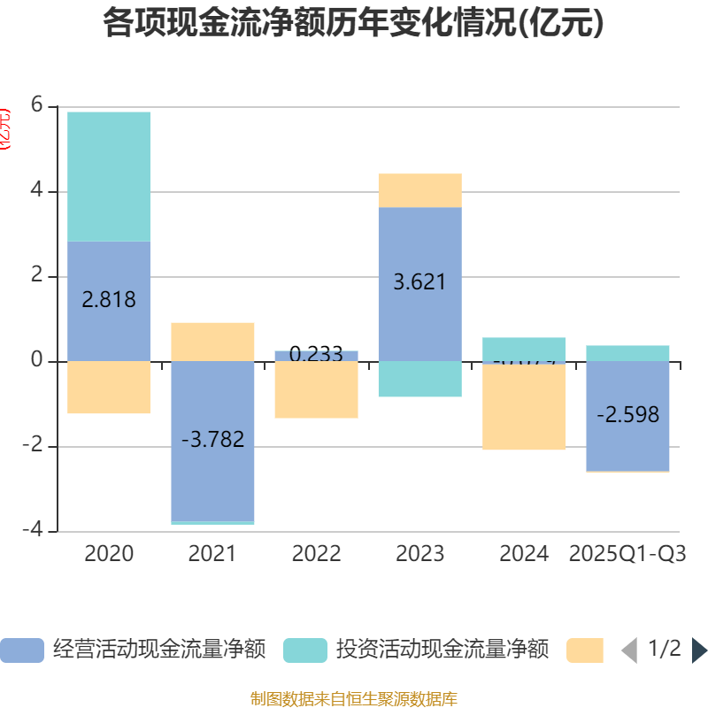 2025年前三季度,公司经营活动现金流净额为-2.6亿元,同比增加1083.58万元;筹资活动现金流净额-262.32万元,同比增加1.23亿元;投资活动现金流净额3662.36万元,上年同期为4214.06万元。