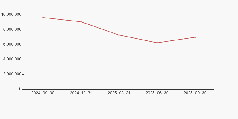 截至2025年9月30日,公司最新总股本为10.46亿股,其中流通股本为9.17亿股。户均持有流通股数量由上期的1.75万股上升至1.86万股,户均流通市值11.28万元。
