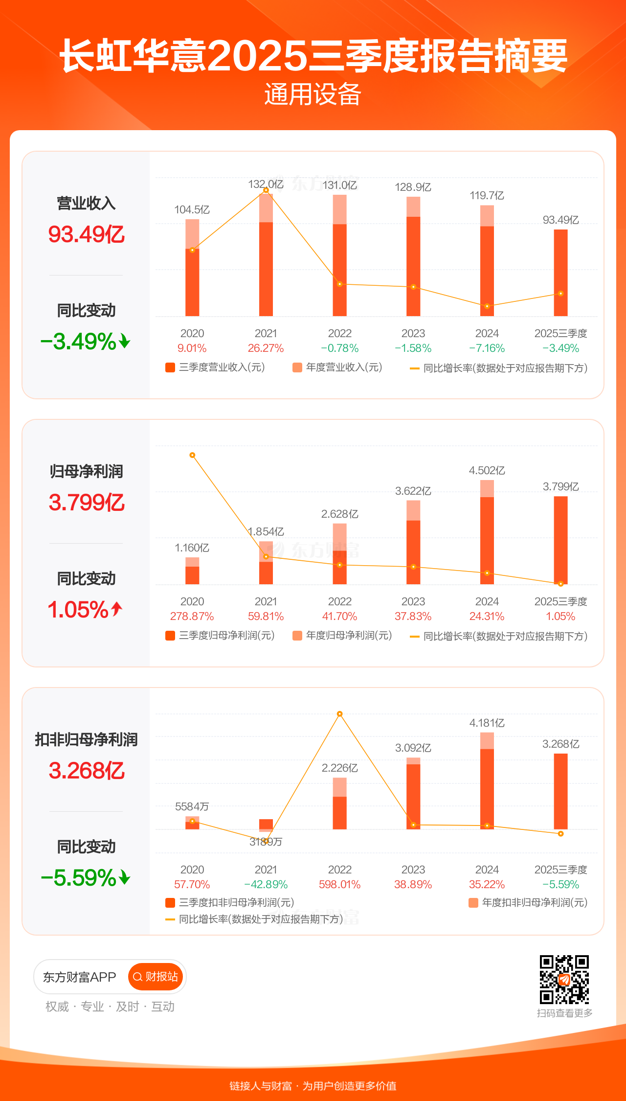 长虹华意10月23日发布2025年三季报显示,公司前三季实现营业收入93.49亿元,同比下滑3.49%;归母净利润3.80亿元,同比增长1.05%;扣非归母净利润3.27亿元,同比下滑5.59%。