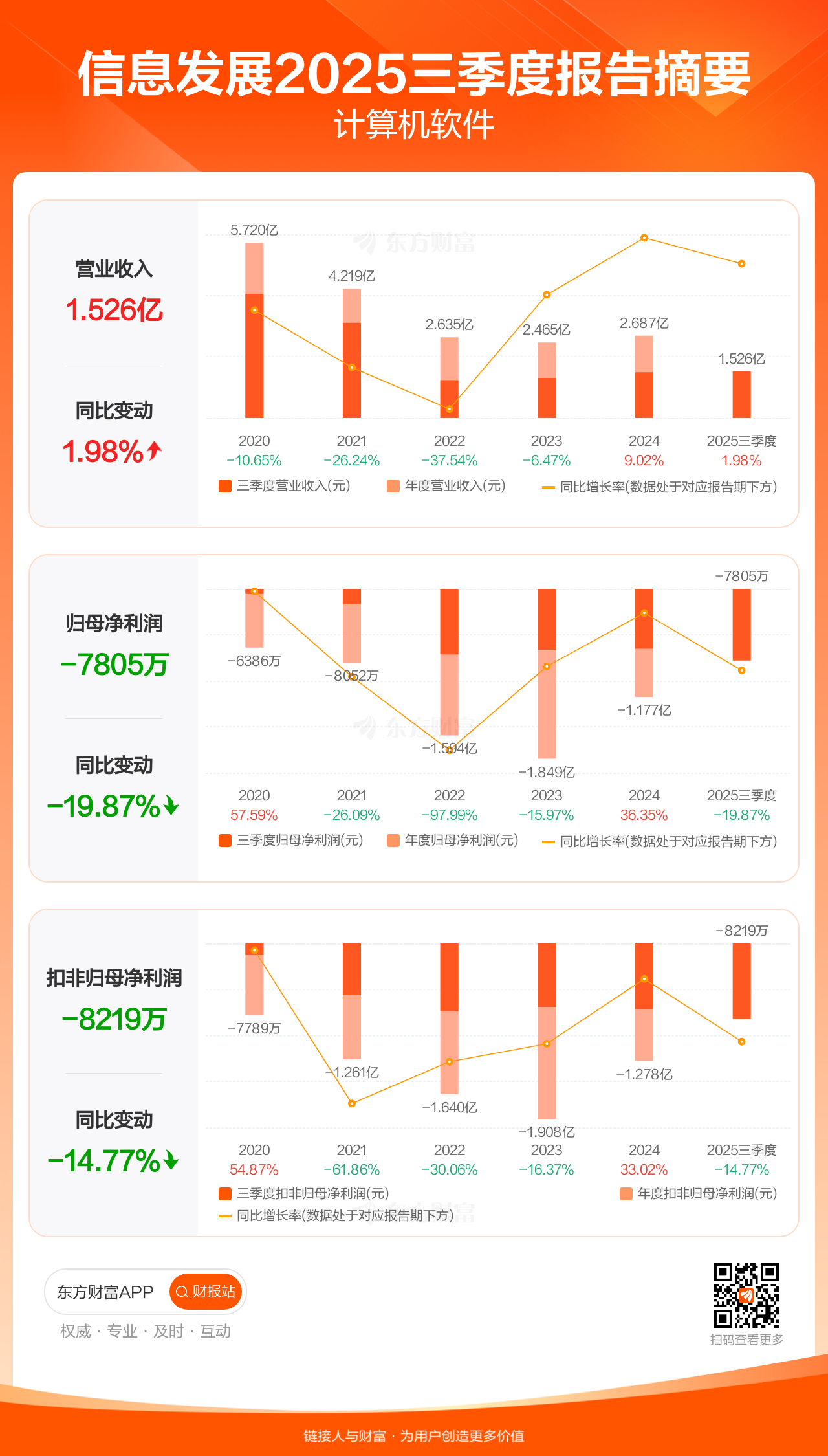信息发展10月29日发布2025年三季报显示,公司前三季实现营业收入1.53亿元,同比增长1.98%;归母净利润-7805.30万元;扣非归母净利润-8219.36万元。