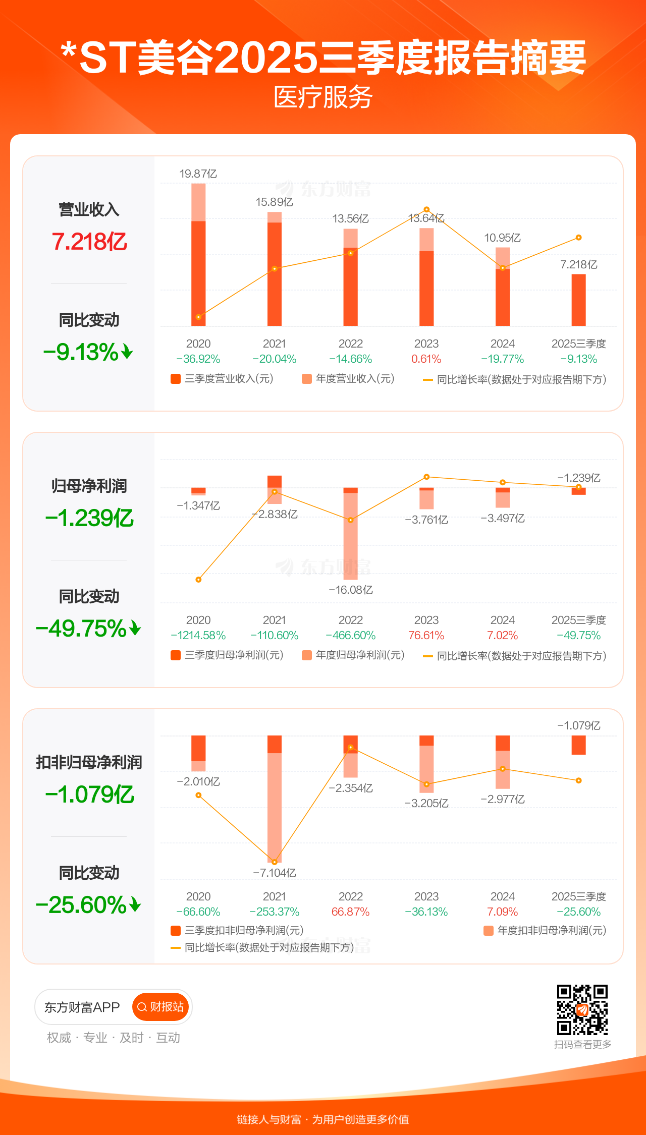 *ST美谷10月29日发布2025年三季报显示,公司前三季实现营业收入7.22亿元,同比下滑9.13%;归母净利润-1.24亿元;扣非归母净利润-1.08亿元。