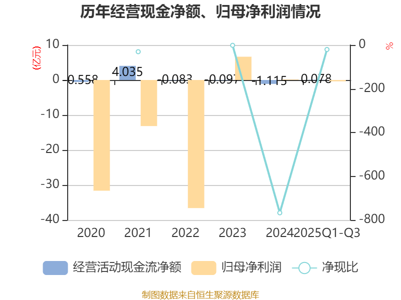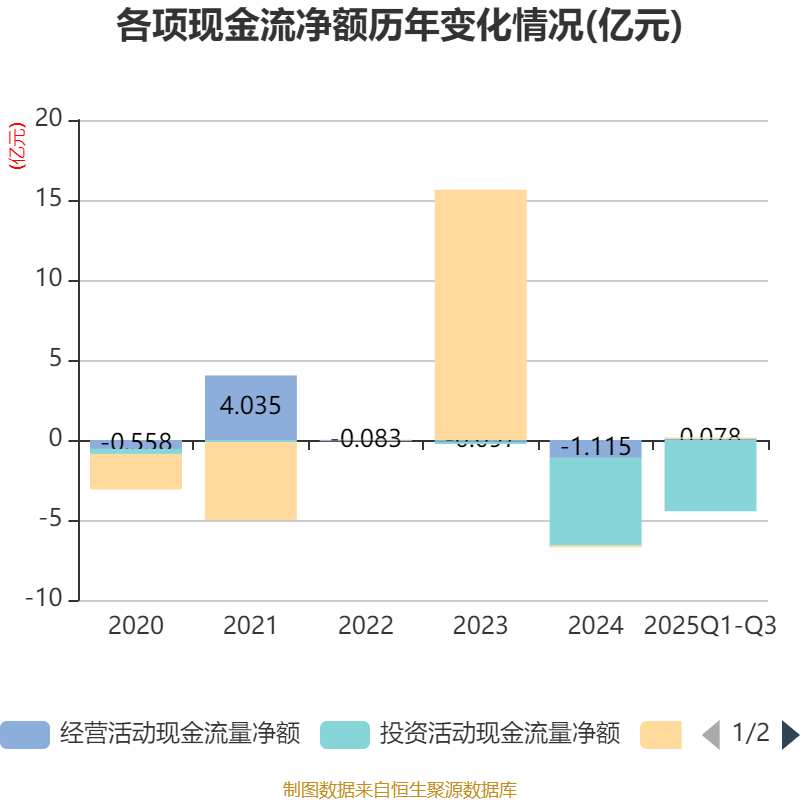 2025年前三季度,公司经营活动现金流净额为776.49万元,同比增加1.41亿元;筹资活动现金流净额816.21万元,同比增加1634.33万元;投资活动现金流净额-4.45亿元,上年同期为-2.88亿元。