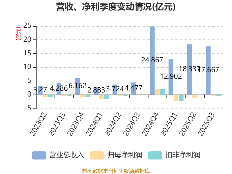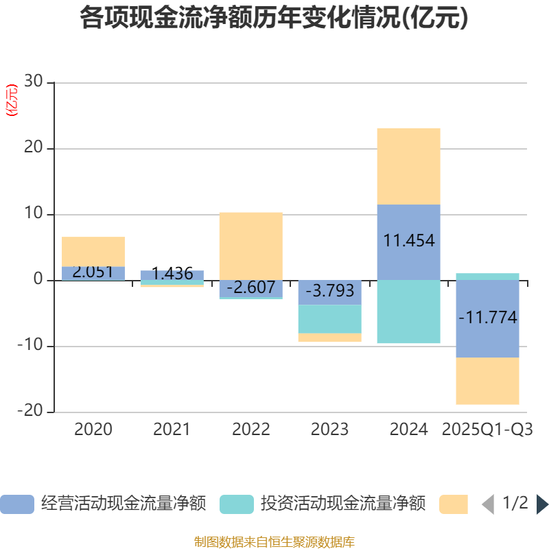 2025年前三季度,公司经营活动现金流净额为-11.77亿元,同比减少7.89亿元;筹资活动现金流净额-7.14亿元,同比减少14.58亿元;投资活动现金流净额1.03亿元,上年同期为-7934.57万元。