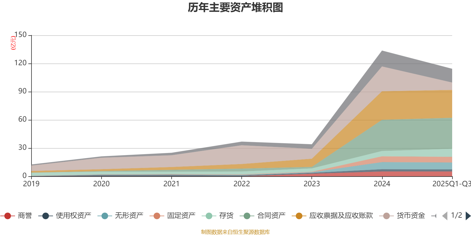 资产重大变化方面,截至2025年三季度末,公司货币资金较上年末减少70.06%,占公司总资产比重下降12.85个百分点;合同资产较上年末减少0.37%,占公司总资产比重上升4.1个百分点;存货较上年末增加51.46%,占公司总资产比重上升3.26个百分点;应收票据及应收账款较上年末减少2.67%,占公司总资产比重上升3.15个百分点。