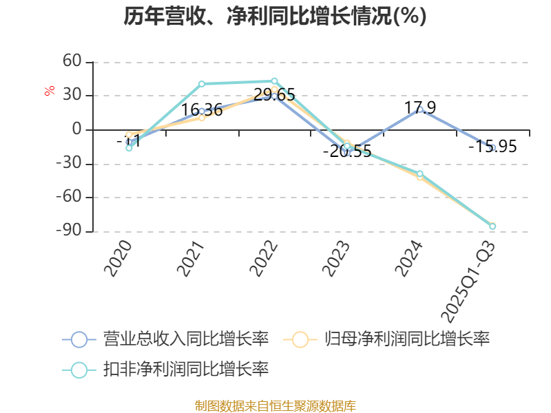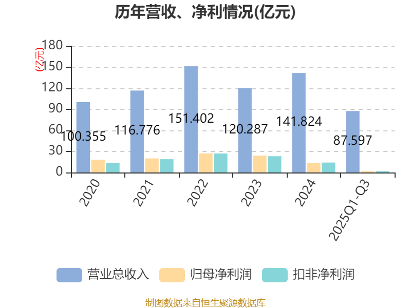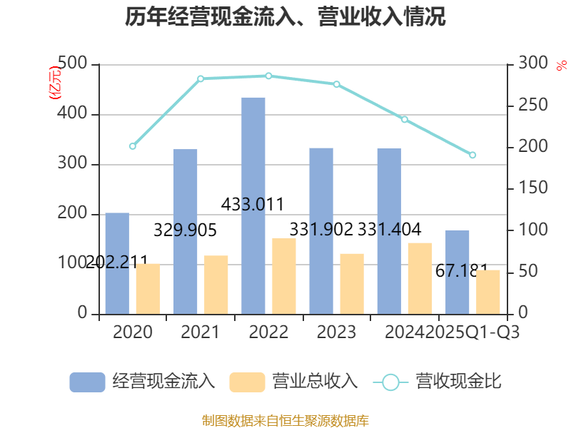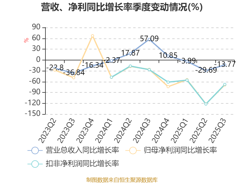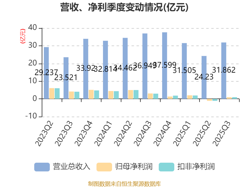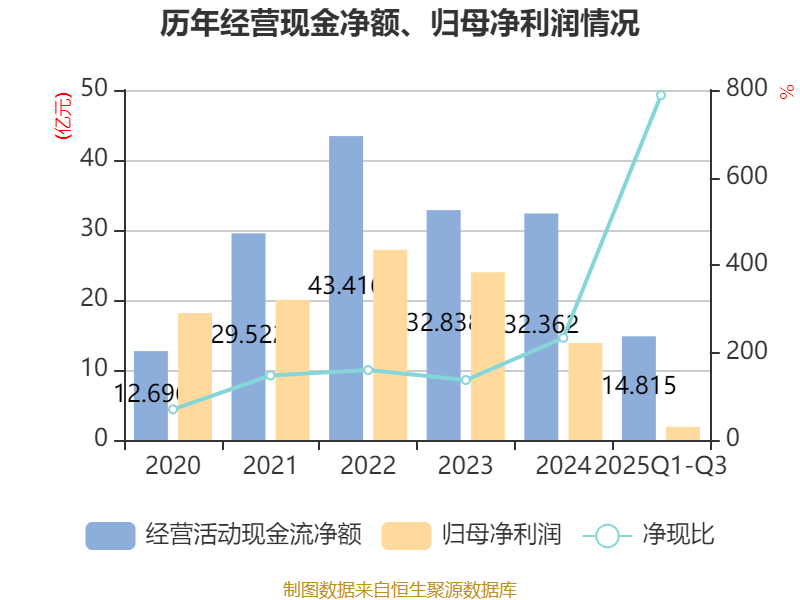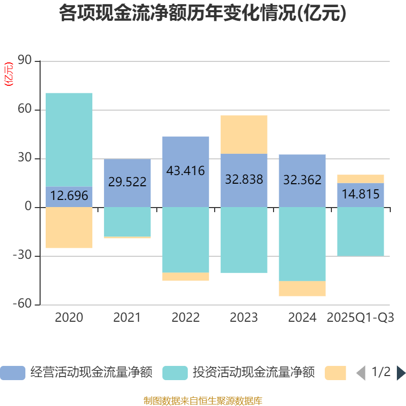 2025年前三季度,公司经营活动现金流净额为14.82亿元,同比下降50.31%;筹资活动现金流净额5.12亿元,同比增加17.12亿元;投资活动现金流净额-30.11亿元,上年同期为-36.87亿元。