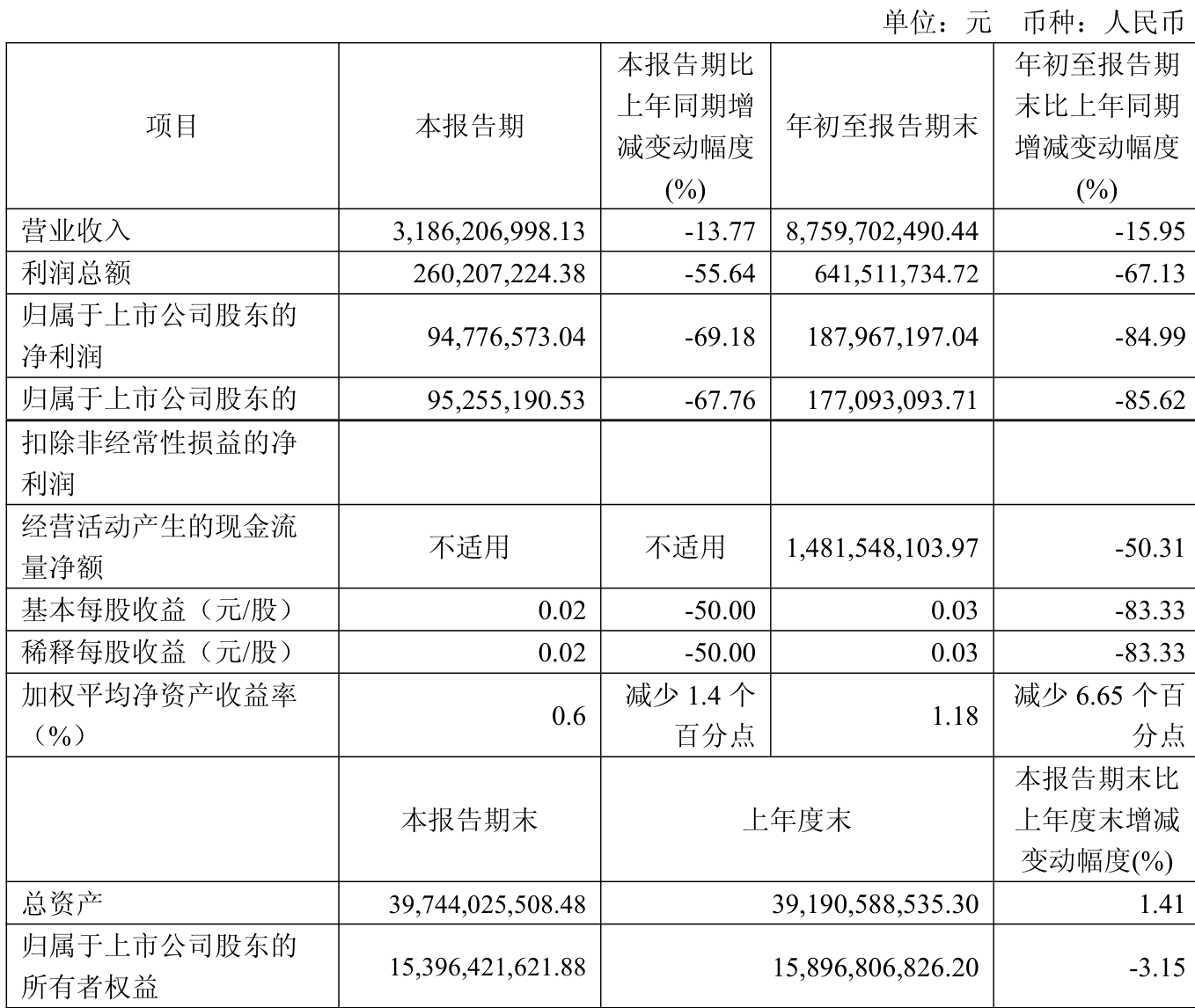 中证智能财讯苏能股份(600925)10月29日披露2025年第三季度报告。前三季度公司实现营业总收入87.6亿元,同比下降15.95%;归母净利润1.88亿元,同比下降84.99%;扣非净利润1.77亿元,同比下降85.62%;经营活动产生的现金流量净额为14.82亿元,同比下降50.31%;报告期内,苏能股份基本每股收益为0.03元,加权平均净资产收益率为1.18%。