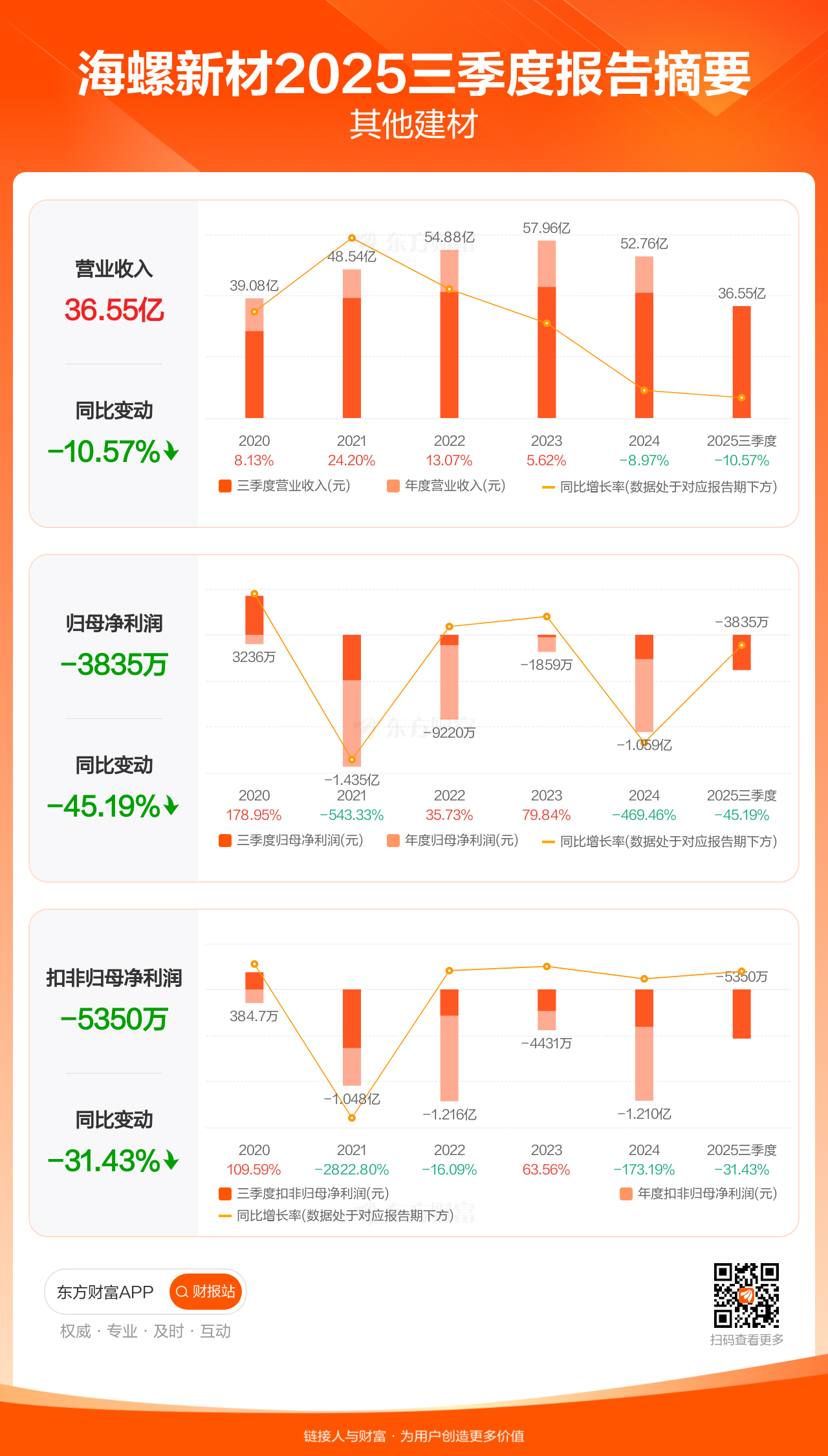 海螺新材10月29日发布2025年三季报显示,公司前三季实现营业收入36.55亿元,同比下滑10.57%;归母净利润-3834.81万元;扣非归母净利润-5349.79万元。