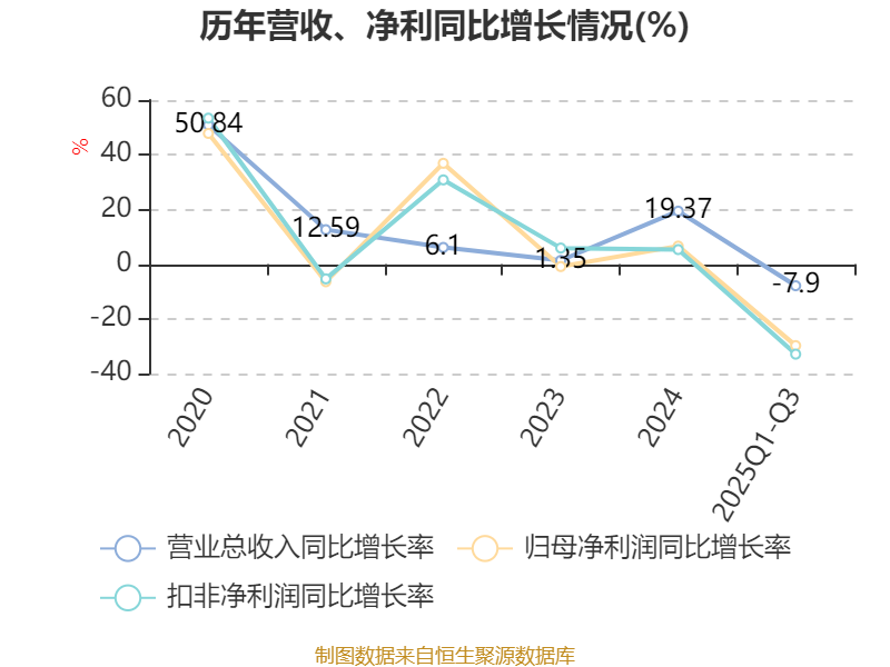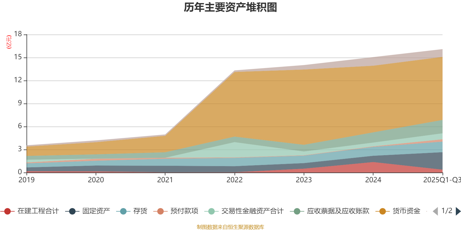 资产重大变化方面,截至2025年三季度末,公司固定资产较上年末增加182.09%,占公司总资产比重上升8.81个百分点;在建工程合计较上年末减少73.29%,占公司总资产比重下降6.8个百分点;货币资金较上年末减少5.39%,占公司总资产比重下降6.63个百分点;应收票据及应收账款较上年末增加30.84%,占公司总资产比重上升1.99个百分点。