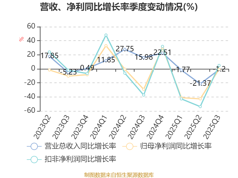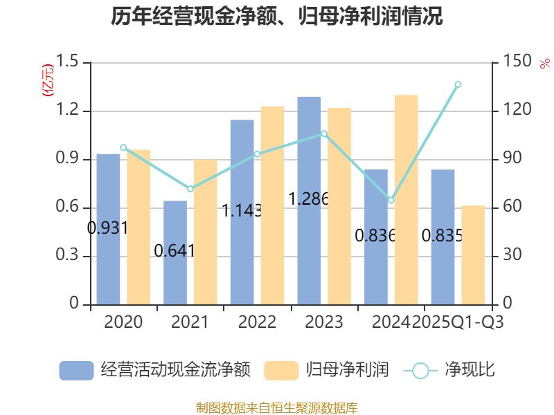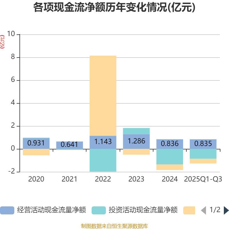 2025年前三季度,公司经营活动现金流净额为8346.53万元,同比增加1.15亿元;筹资活动现金流净额-4039.48万元,同比增加691万元;投资活动现金流净额-8686.67万元,上年同期为-3525.32万元。
