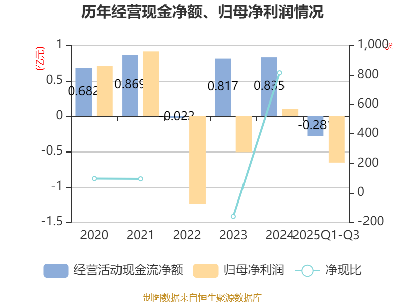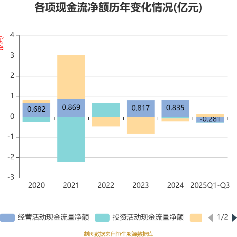 2025年前三季度,公司经营活动现金流净额为-2809.96万元,同比减少4758.42万元;筹资活动现金流净额1496.08万元,同比增加2547.9万元;投资活动现金流净额-347.56万元,上年同期为-5965.72万元。