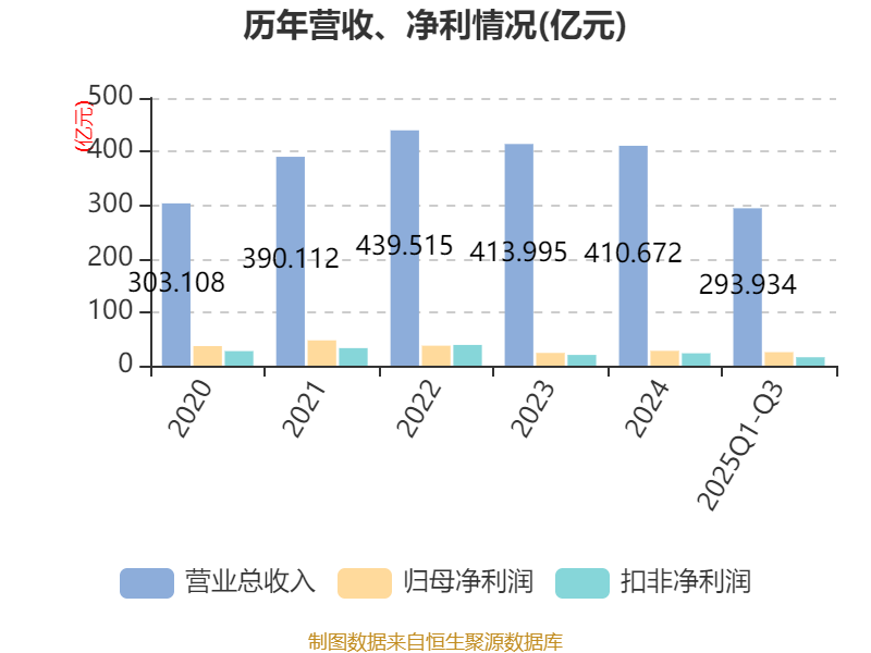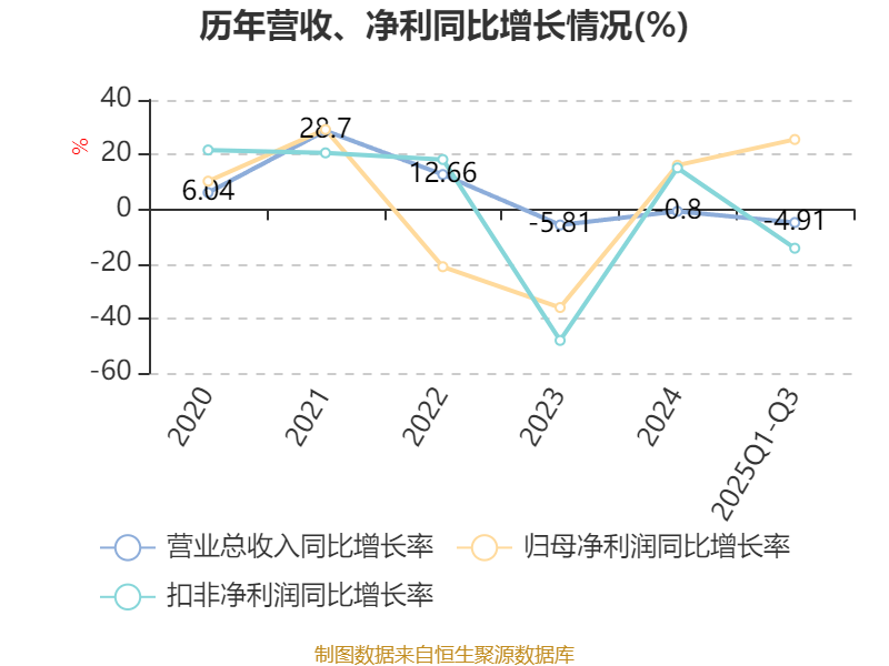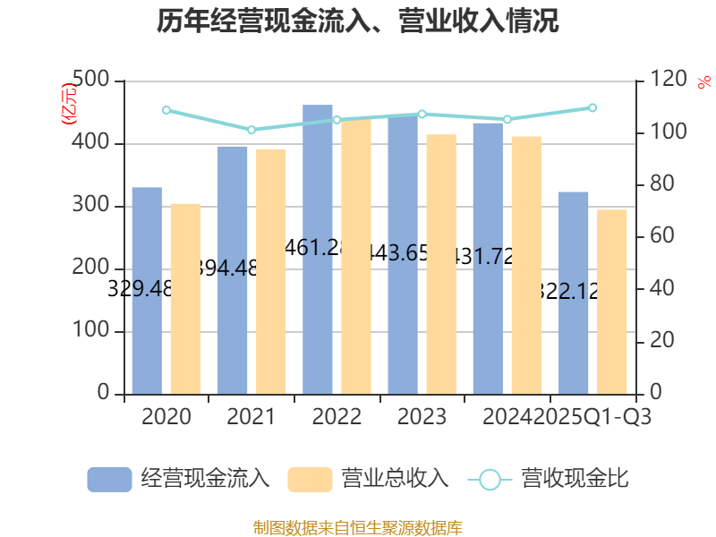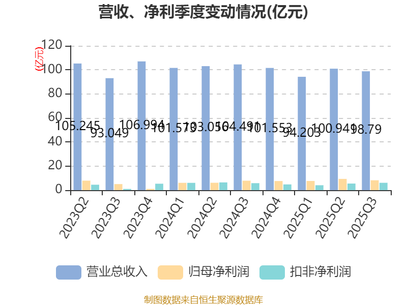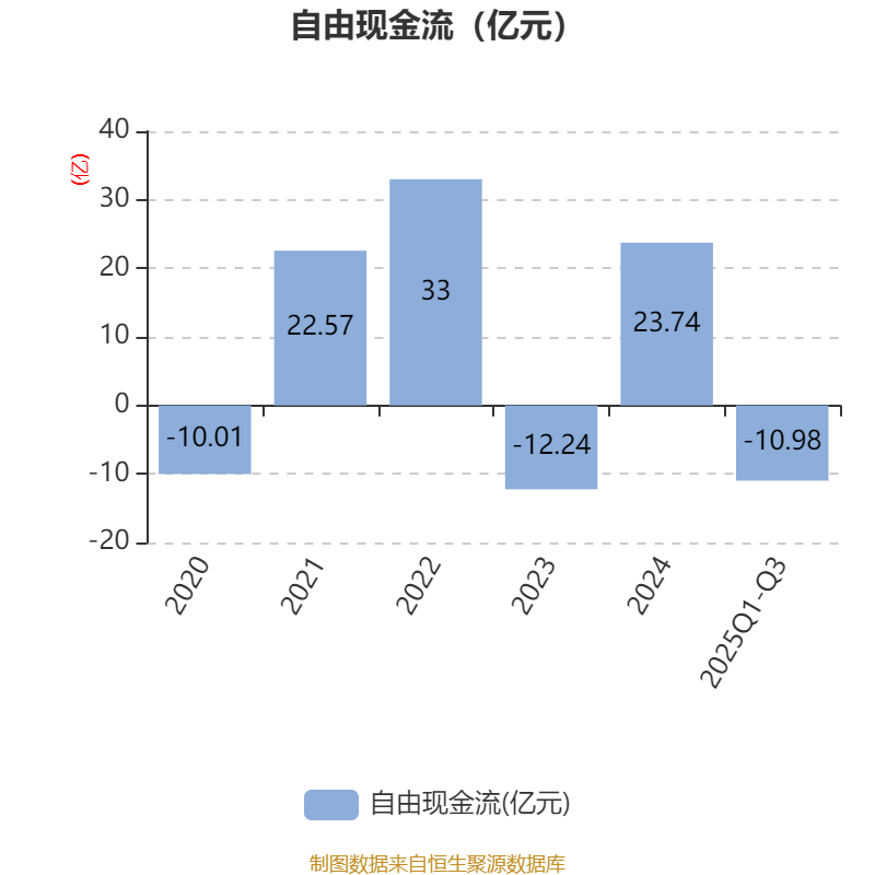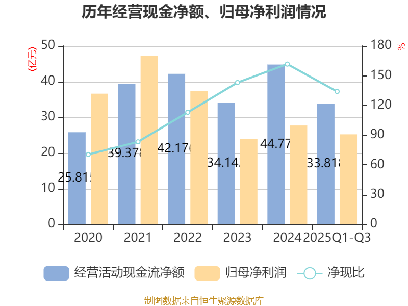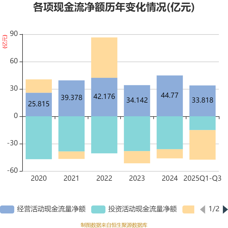2025年前三季度,公司经营活动现金流净额为33.82亿元,同比增长13.23%;筹资活动现金流净额-32.44亿元,同比减少27.42亿元;投资活动现金流净额-15.12亿元,上年同期为-24.4亿元。