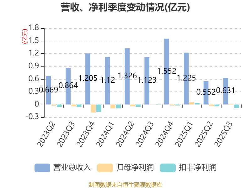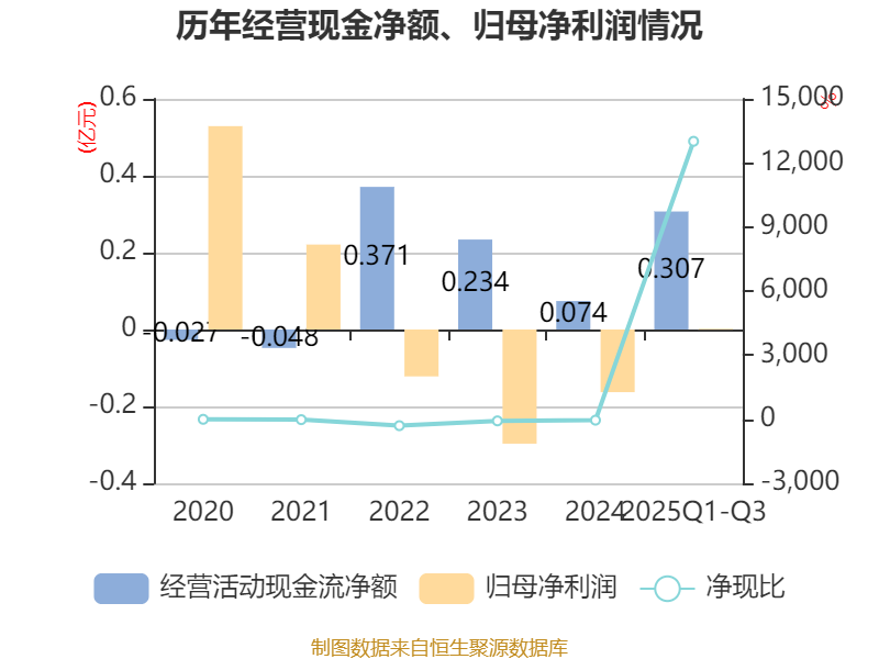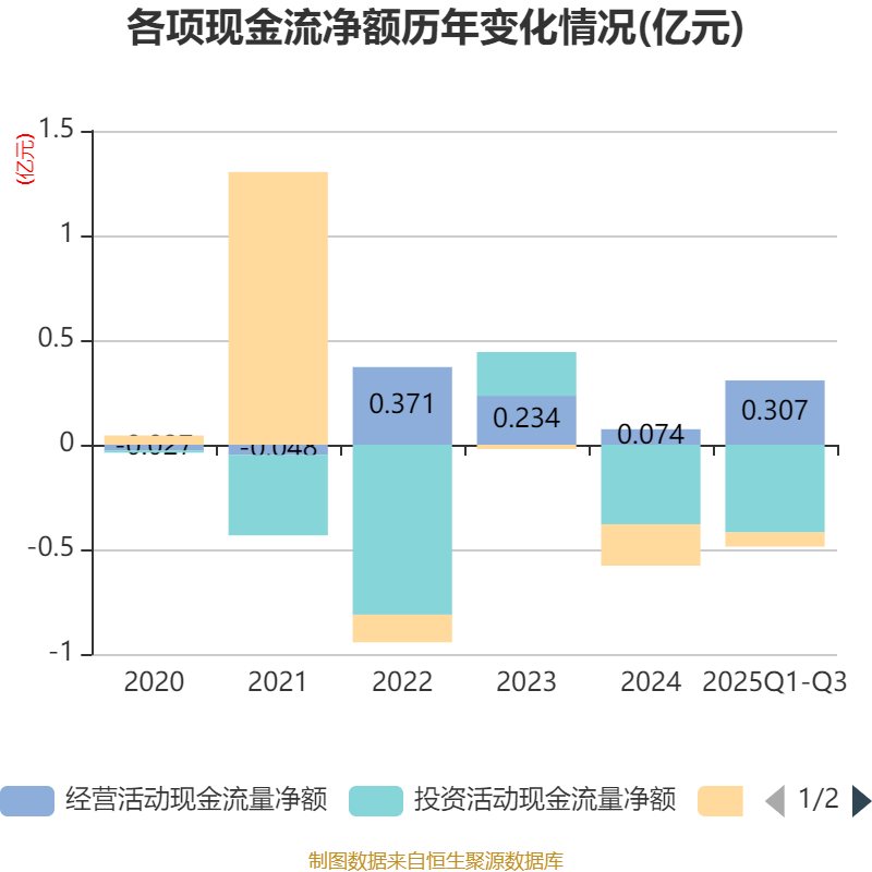 2025年前三季度,公司经营活动现金流净额为3073.26万元,同比增长312.55%;筹资活动现金流净额-677.12万元,同比减少1213.95万元;投资活动现金流净额-4193.92万元,上年同期为-6138.35万元。