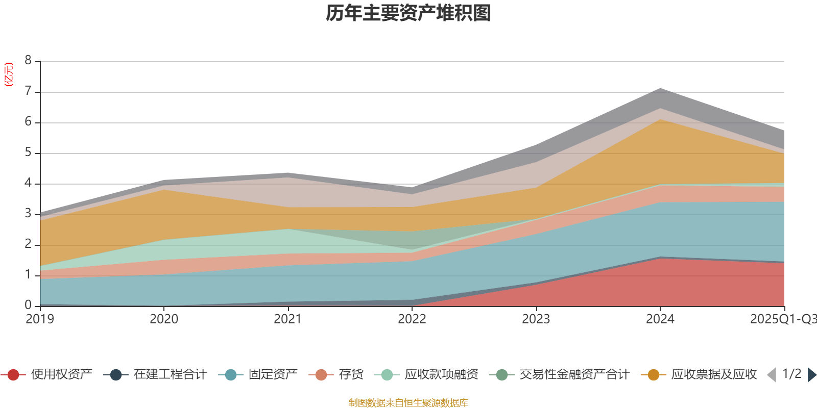 资产重大变化方面,截至2025年三季度末,公司应收票据及应收账款较上年末减少54.88%,占公司总资产比重下降13.12个百分点;固定资产较上年末增加9.89%,占公司总资产比重上升9.08个百分点;货币资金较上年末减少61.51%,占公司总资产比重下降2.62个百分点;使用权资产较上年末减少9.88%,占公司总资产比重上升2.58个百分点。