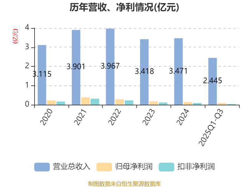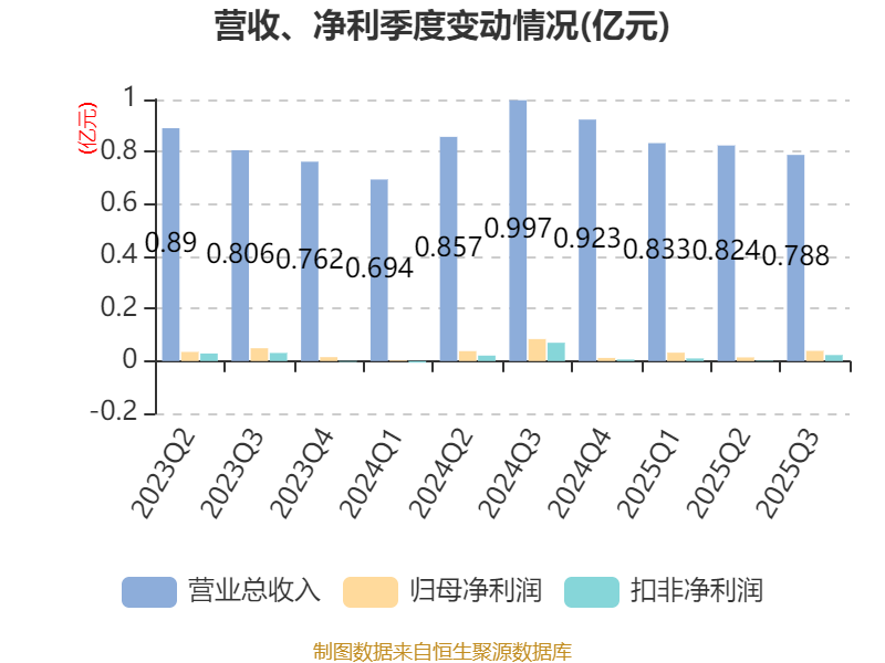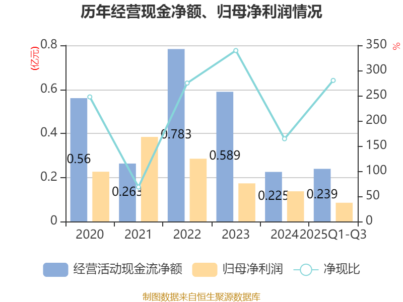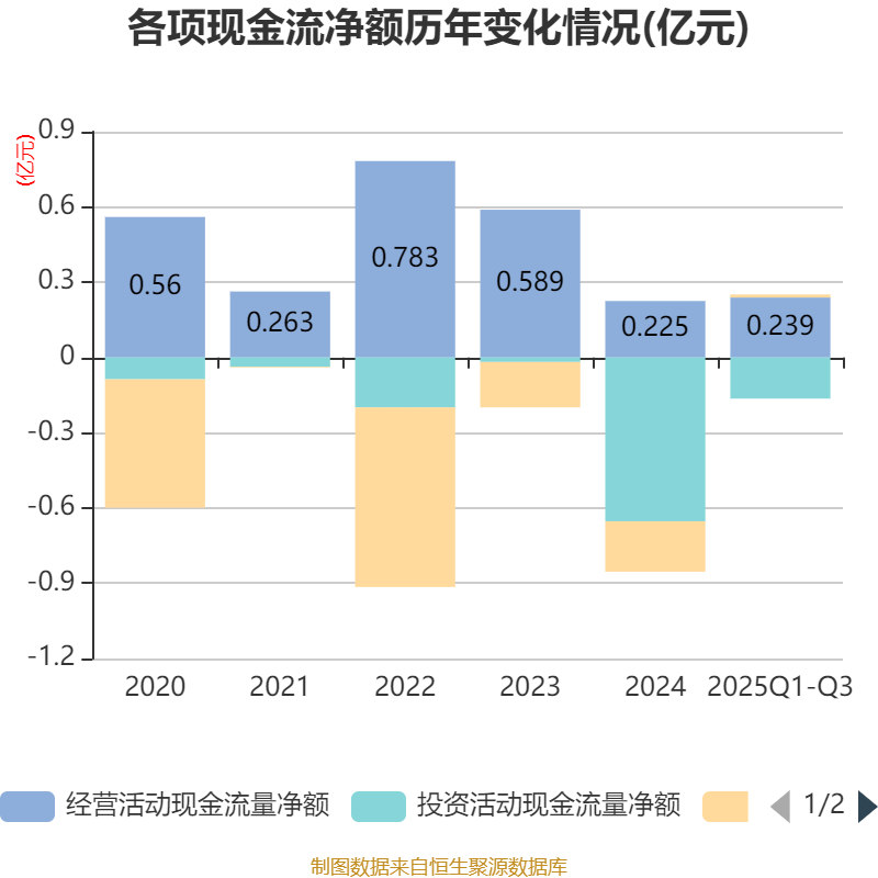 2025年前三季度,公司经营活动现金流净额为2390.74万元,同比下降37.95%;筹资活动现金流净额123.52万元,同比增加3974.67万元;投资活动现金流净额-1644.88万元,上年同期为-6206.83万元。