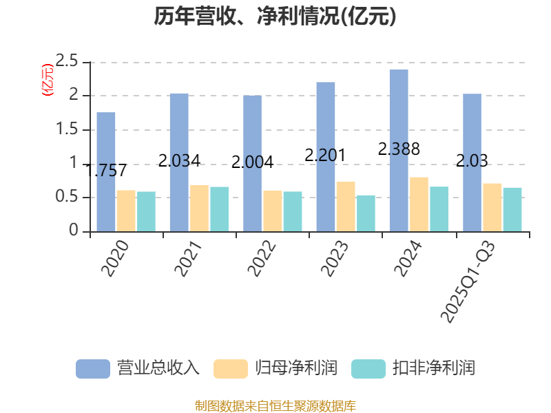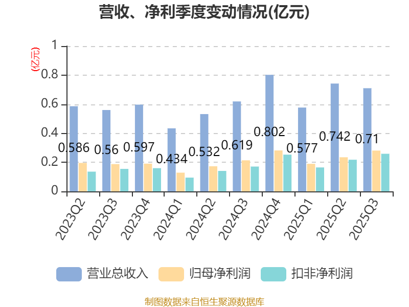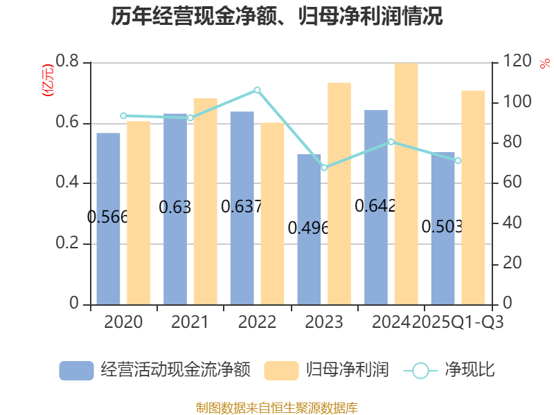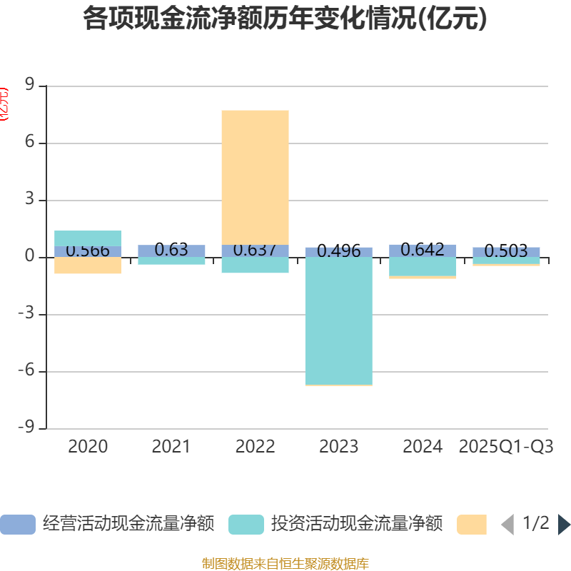 2025年前三季度,公司经营活动现金流净额为5032.09万元,同比增长65.97%;筹资活动现金流净额-1023.76万元,同比减少209.4万元;投资活动现金流净额-3708.53万元,上年同期为802.26万元。
