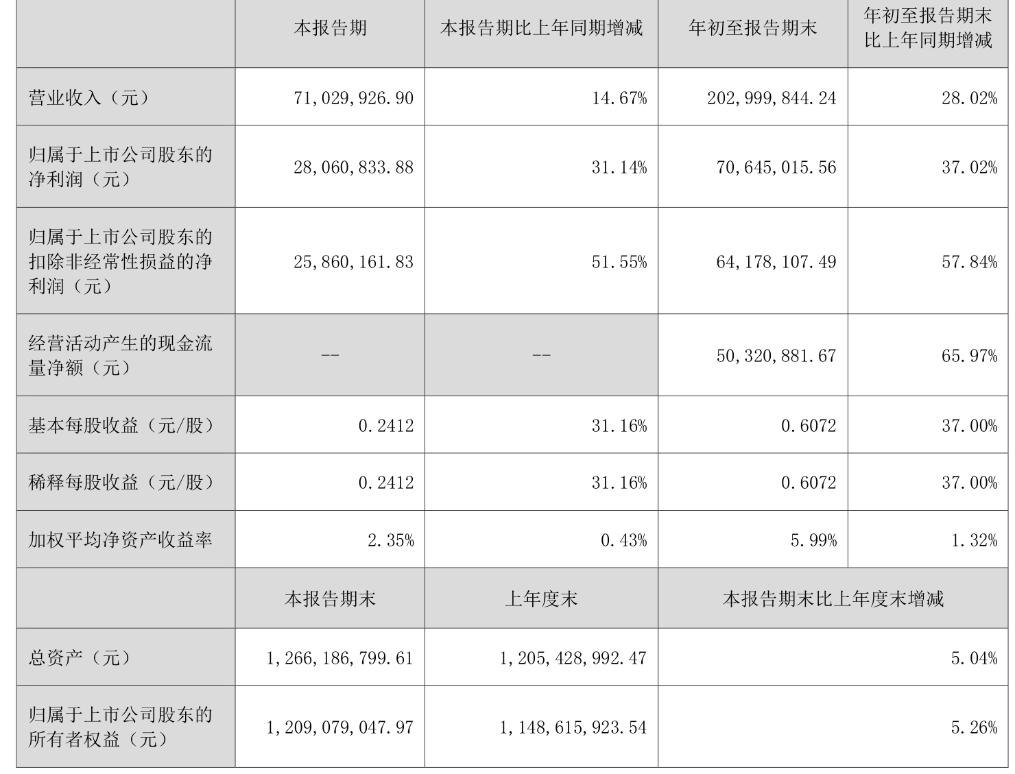 中证智能财讯众智科技(301361)10月29日披露2025年第三季度报告。前三季度公司实现营业总收入2.03亿元,同比增长28.02%;归母净利润7064.5万元,同比增长37.02%;扣非净利润6417.81万元,同比增长57.84%;经营活动产生的现金流量净额为5032.09万元,同比增长65.97%;报告期内,众智科技基本每股收益为0.6072元,加权平均净资产收益率为5.99%。