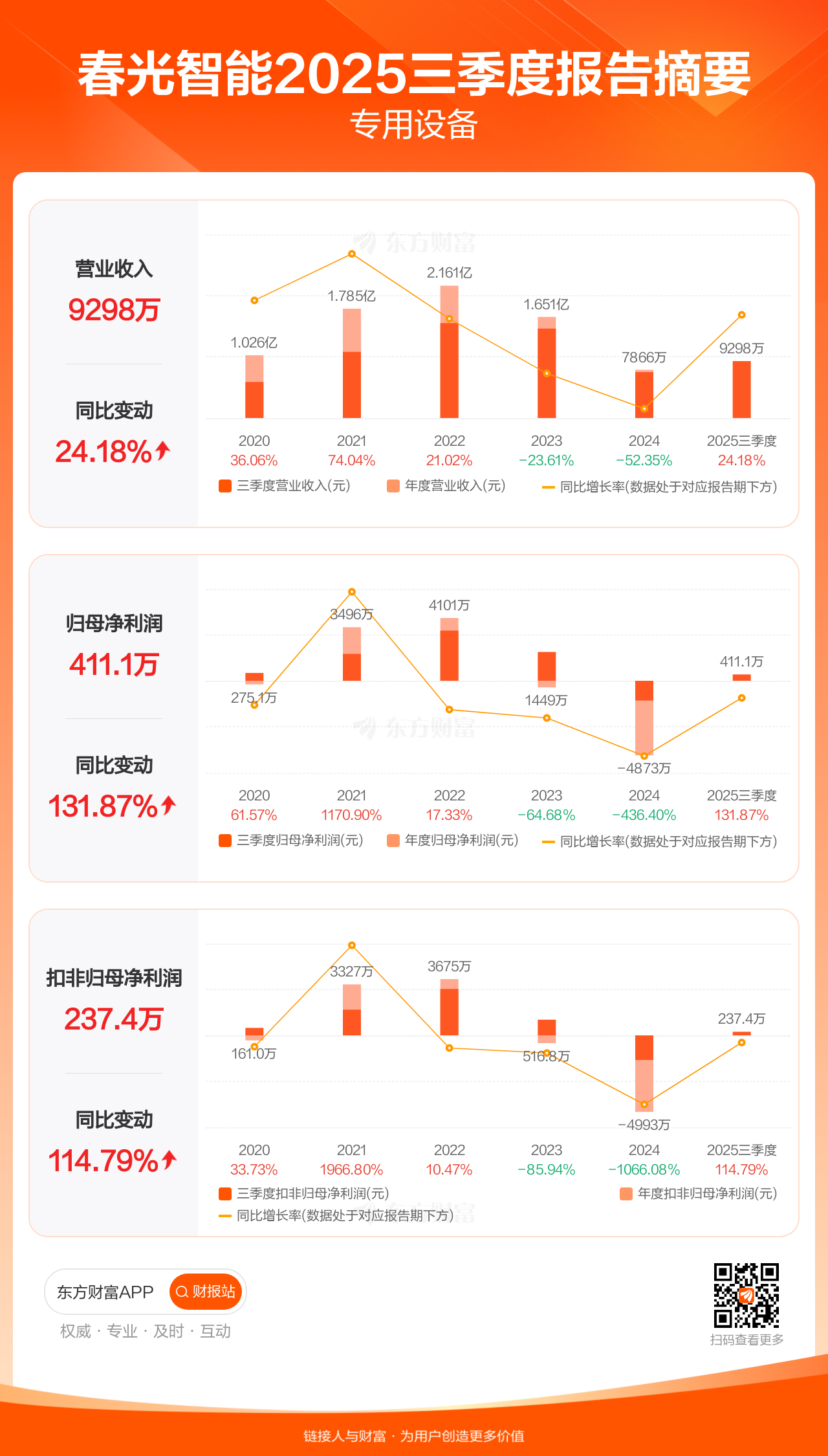 春光智能10月28日发布2025年三季报显示,公司前三季实现营业收入9297.72万元,同比增长24.18%;归母净利润411.15万元,同比增长131.87%;扣非归母净利润237.45万元,同比增长114.79%。