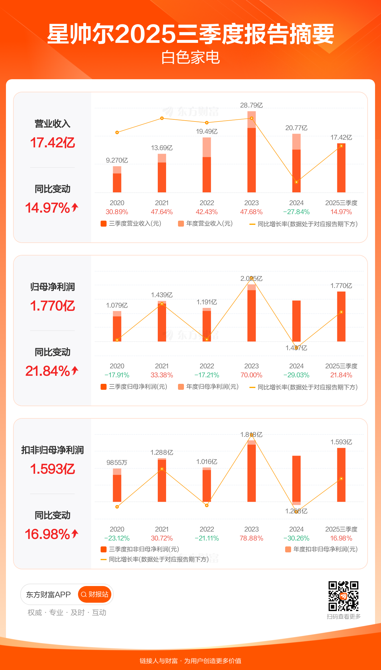星帅尔10月29日发布2025年三季报显示,公司前三季实现营业收入17.42亿元,同比增长14.97%;归母净利润1.77亿元,同比增长21.84%;扣非归母净利润1.59亿元,同比增长16.98%。