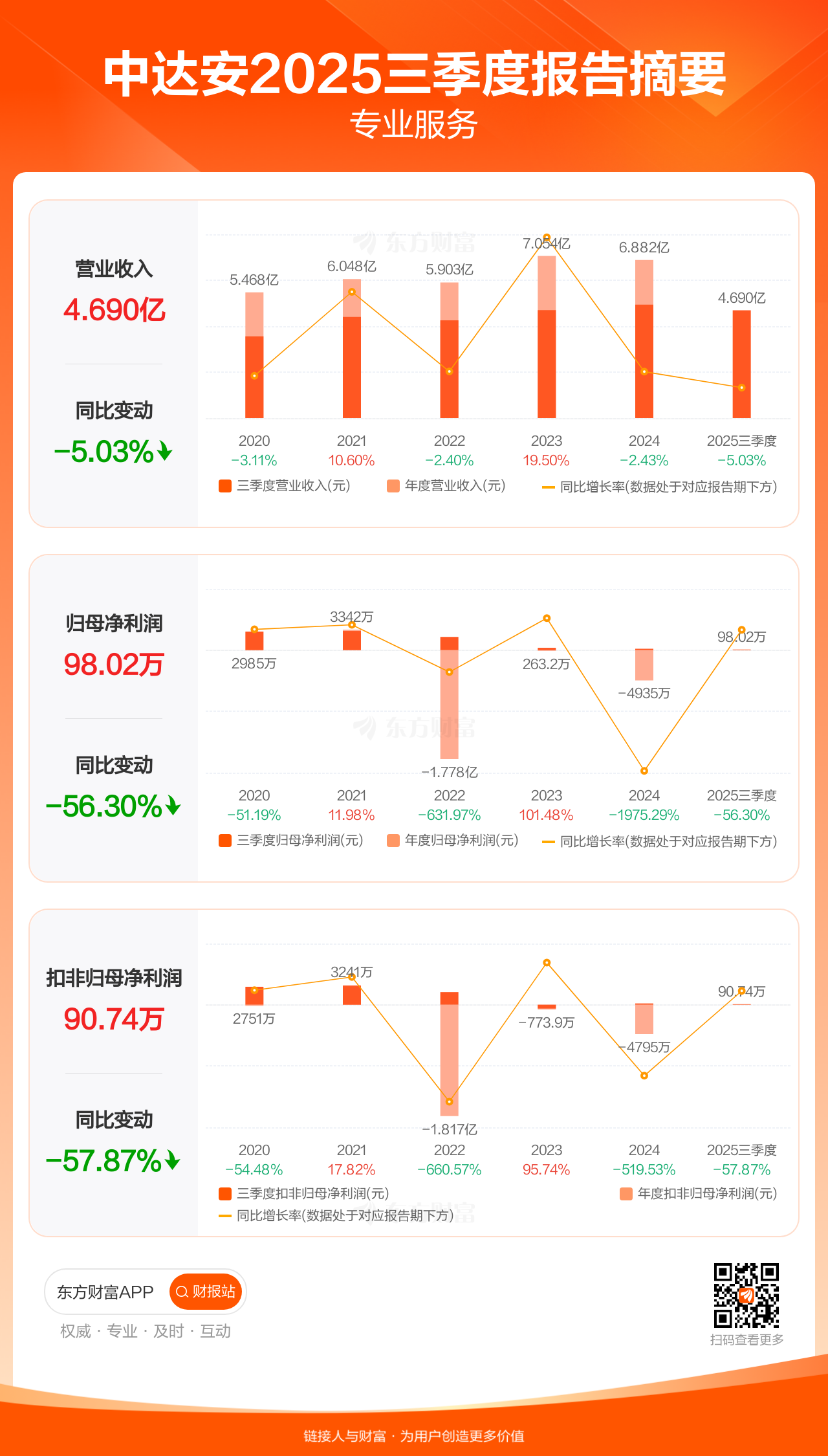 中达安10月29日发布2025年三季报显示,公司前三季实现营业收入4.69亿元,同比下滑5.03%;归母净利润98.02万元,同比下滑56.30%;扣非归母净利润90.74万元,同比下滑57.87%。