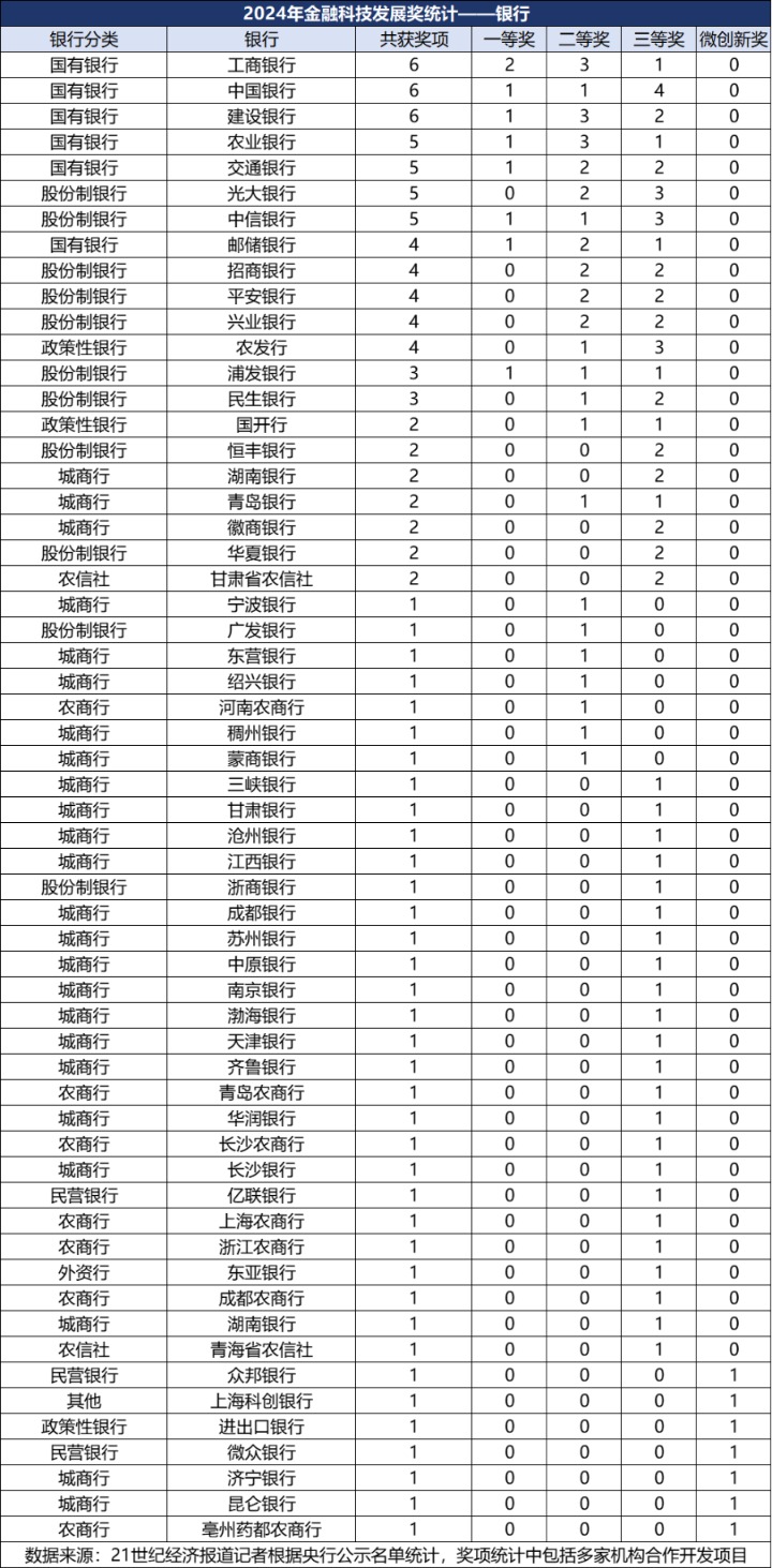 综合所有获奖名单来看,若将多家金融机构合作开发项目统计在内,国有大行科技表现亮眼,工商银行、中国银行、建设银行三家国有银行分别拿下6个奖项,农业银行、交通银行、光大银行、中信银行分别拿下5个奖项,邮储银行、招商银行、平安银行、兴业银行、中国农业发展银行分别拿下4个奖项。