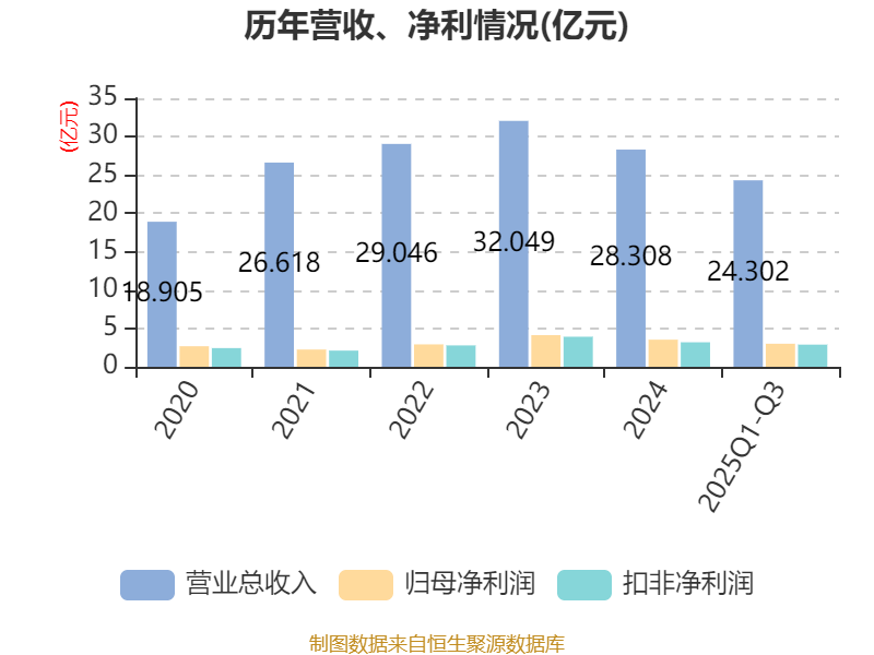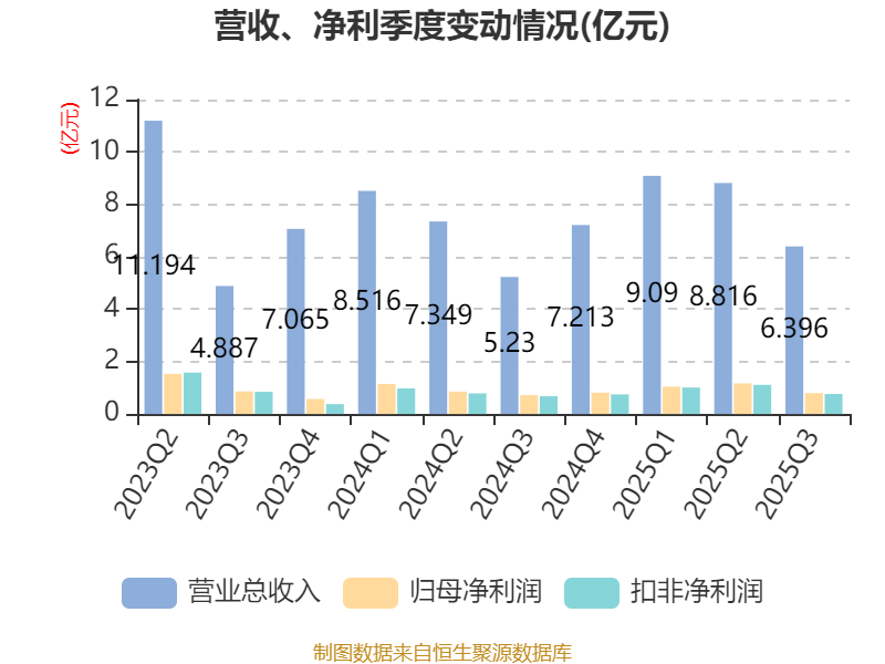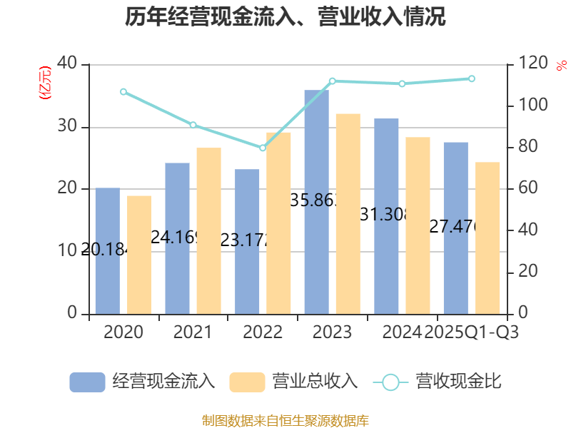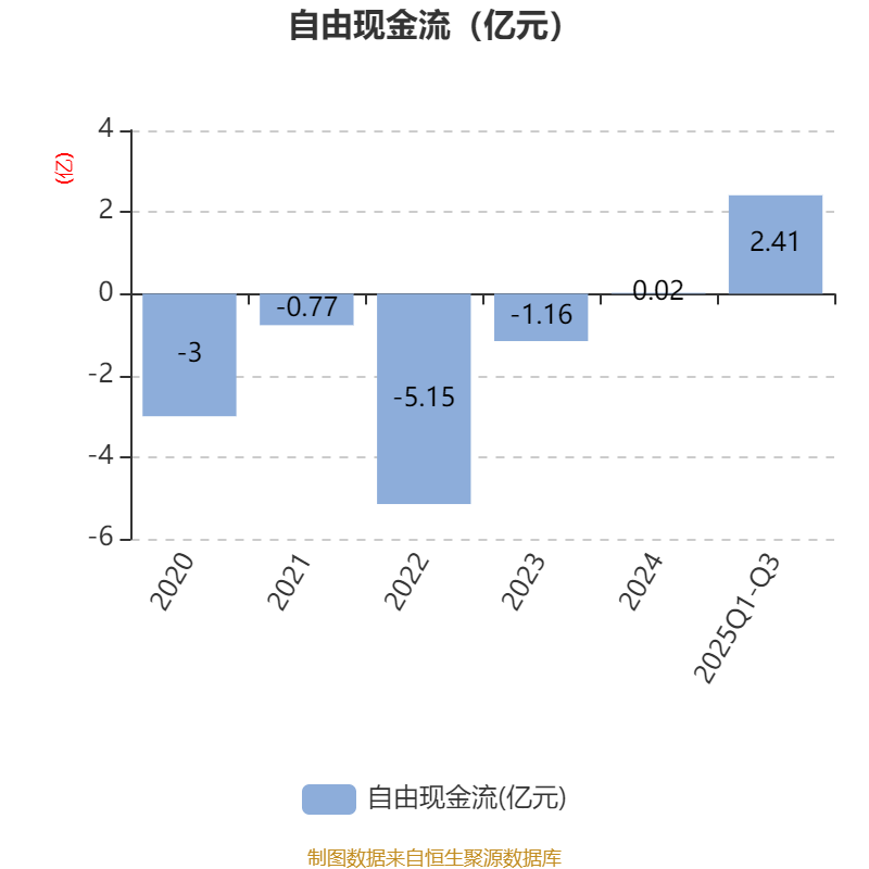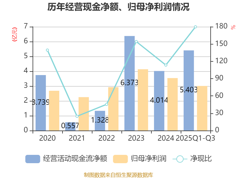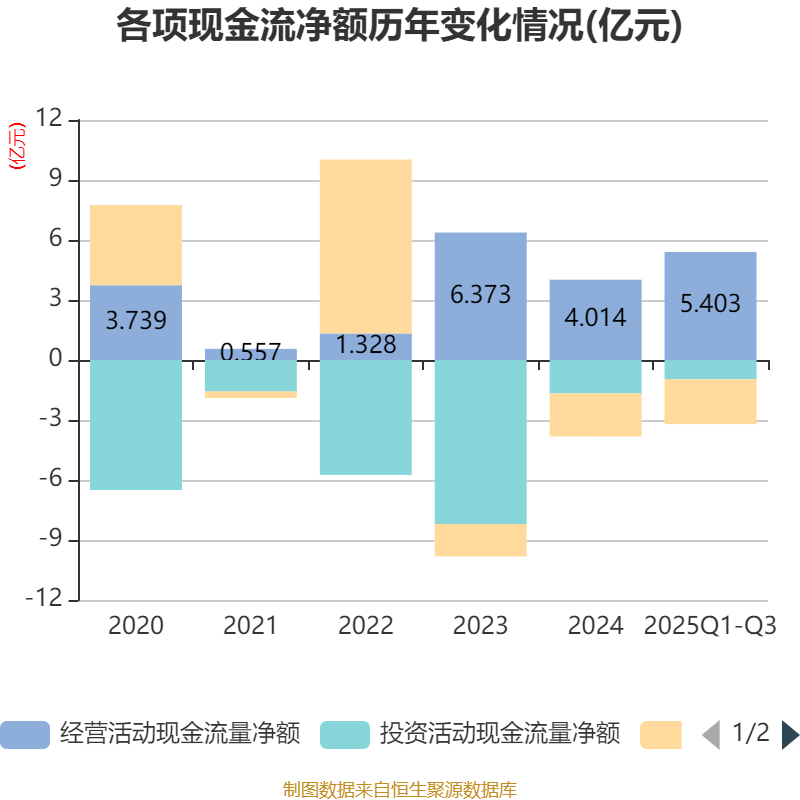 2025年前三季度,公司经营活动现金流净额为5.4亿元,同比增长60.11%;筹资活动现金流净额-2.24亿元,同比减少504.64万元;投资活动现金流净额-9632.76万元,上年同期为7816.4万元。