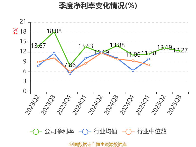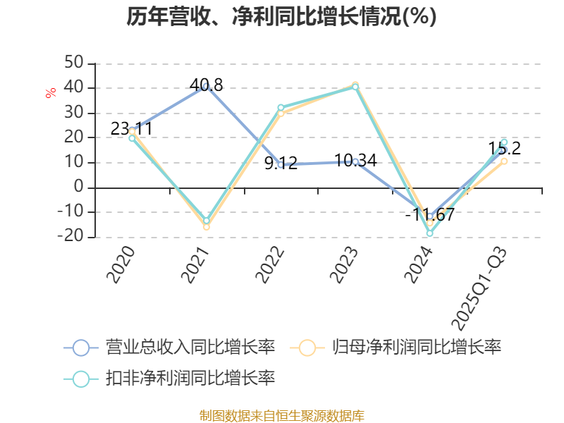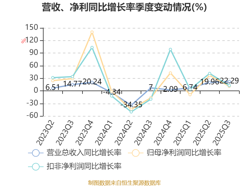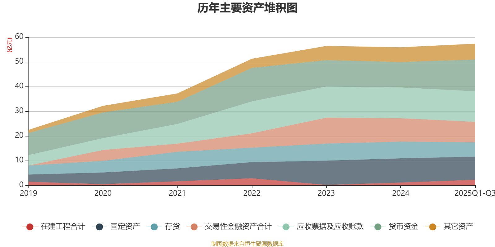 资产重大变化方面,截至2025年三季度末,公司货币资金较上年末增加24.75%,占公司总资产比重上升3.99个百分点;交易性金融资产合计较上年末减少12.51%,占公司总资产比重下降2.5个百分点;存货较上年末减少14.55%,占公司总资产比重下降2.02个百分点;在建工程合计较上年末增加101.7%,占公司总资产比重上升1.87个百分点。