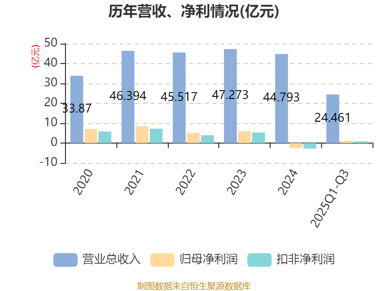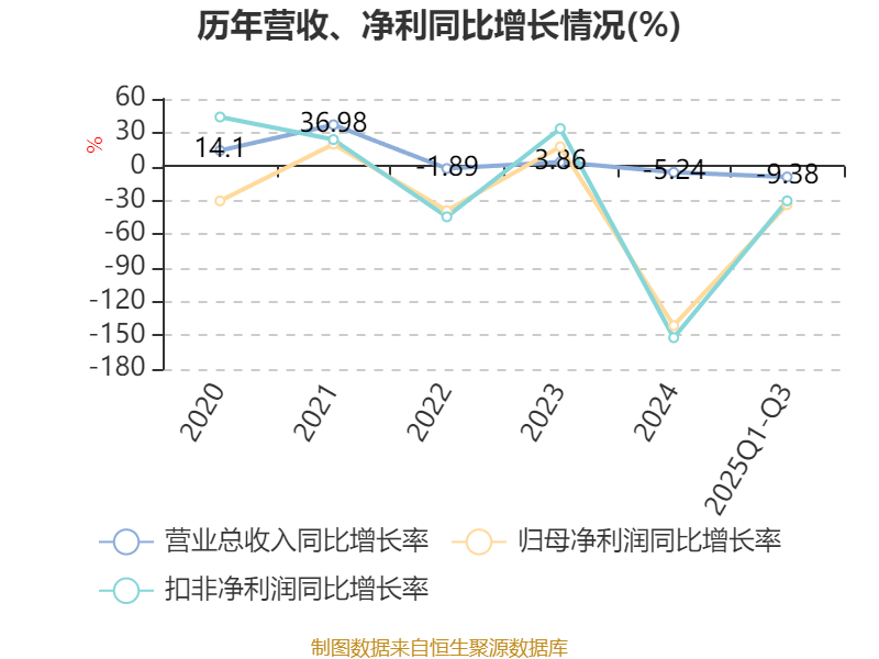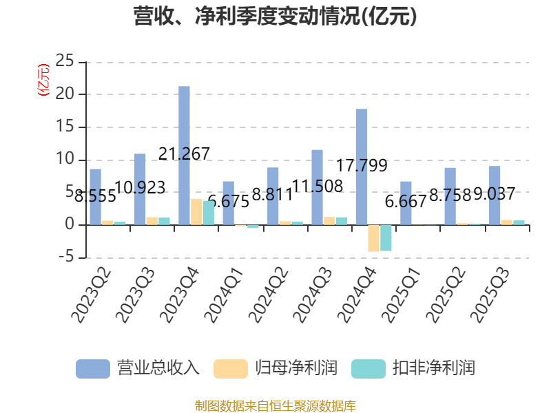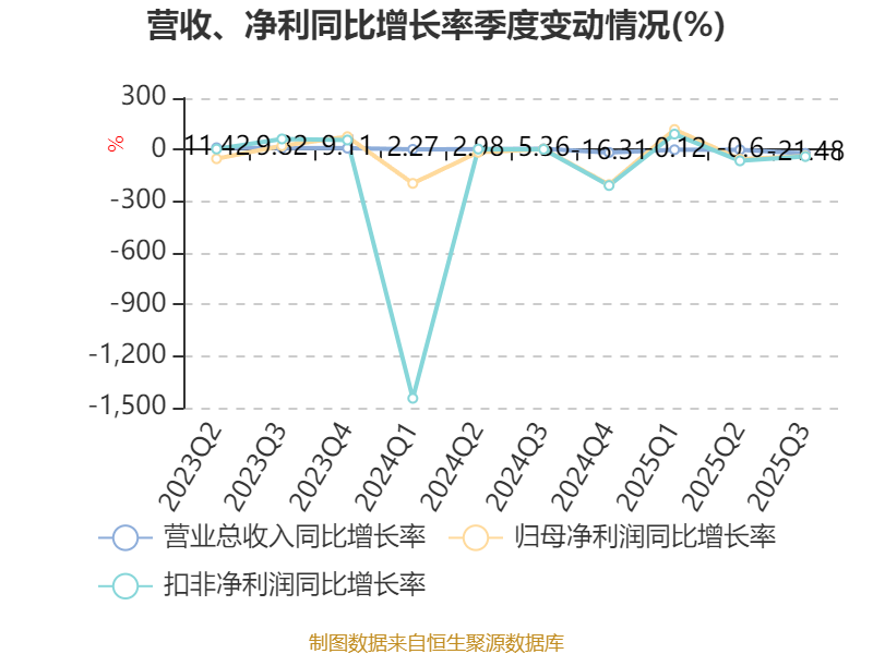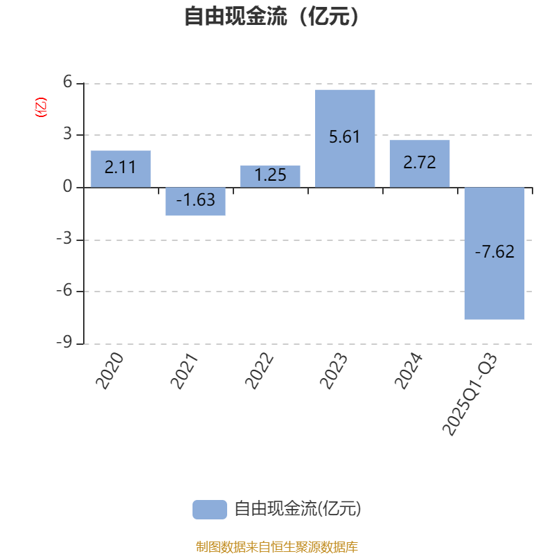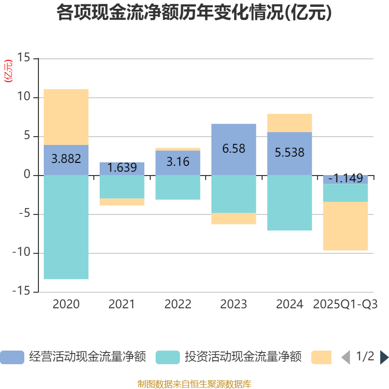 2025年前三季度,公司经营活动现金流净额为-1.15亿元,同比减少1.87亿元;筹资活动现金流净额-6.26亿元,同比减少8.1亿元;投资活动现金流净额-2.29亿元,上年同期为-5.15亿元。