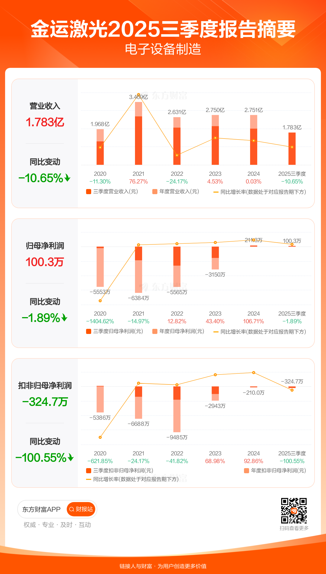 金运激光10月29日发布2025年三季报显示,公司前三季实现营业收入1.78亿元,同比下滑10.65%;归母净利润100.33万元,同比下滑1.89%;扣非归母净利润-324.73万元。