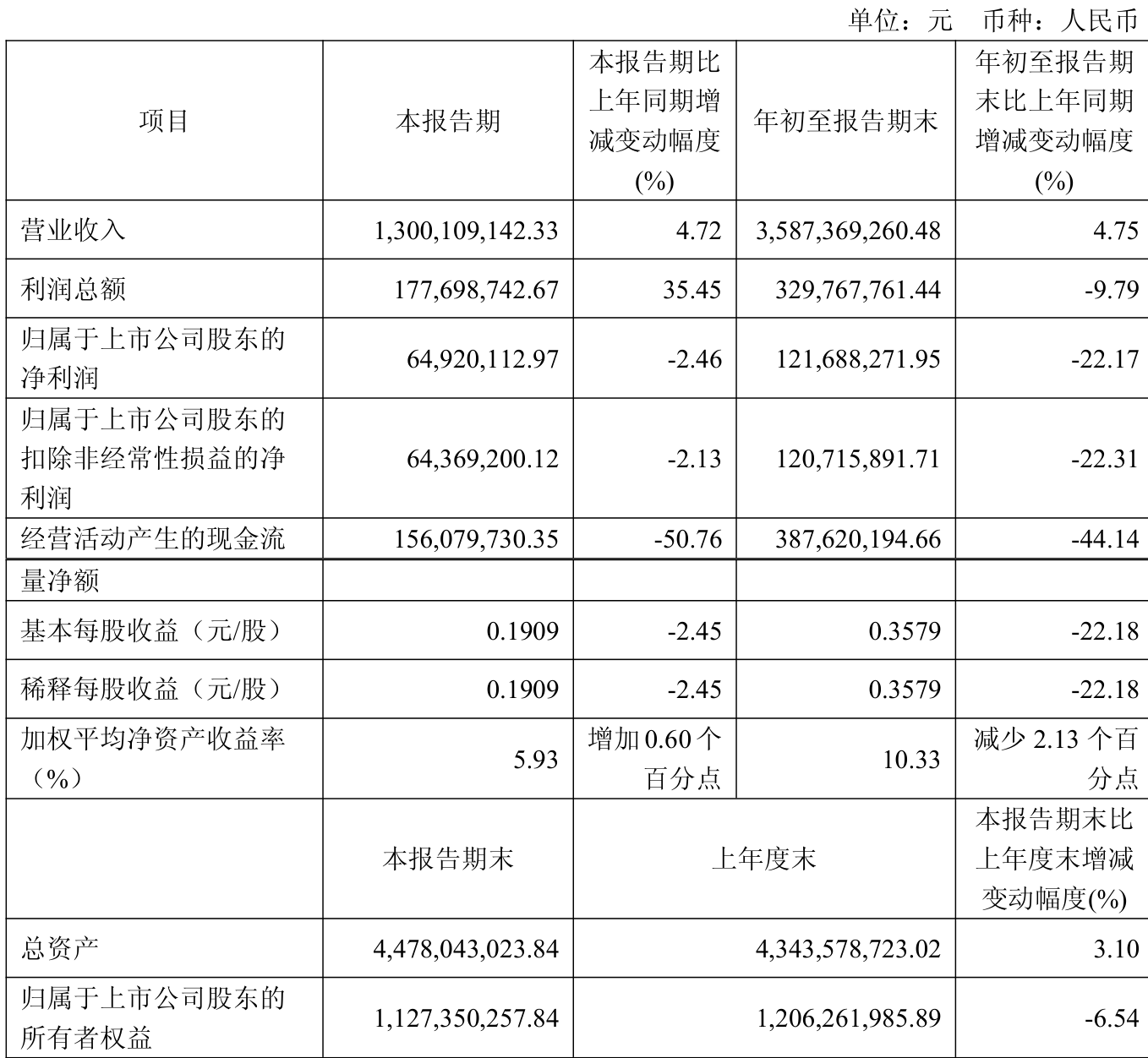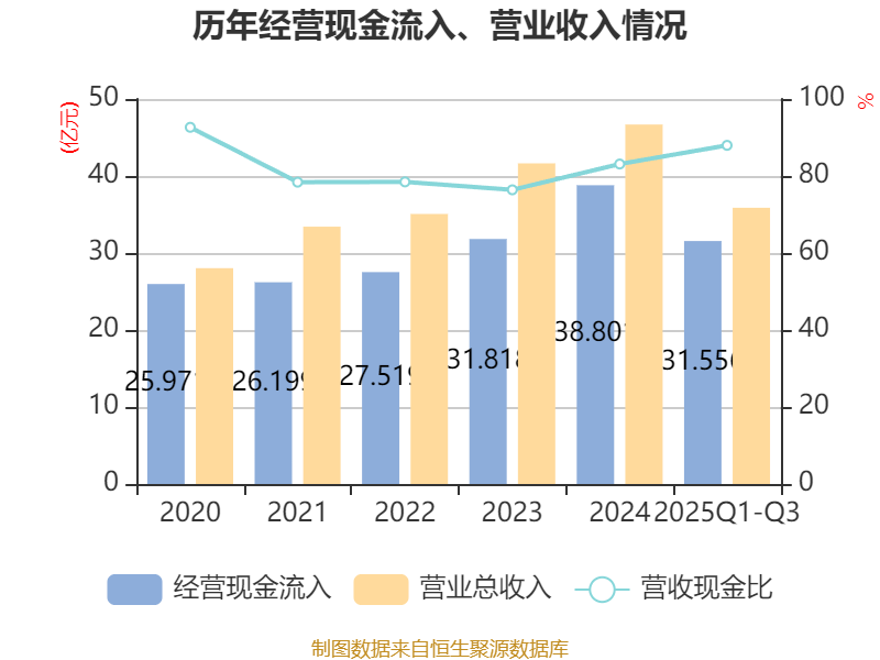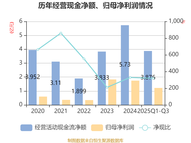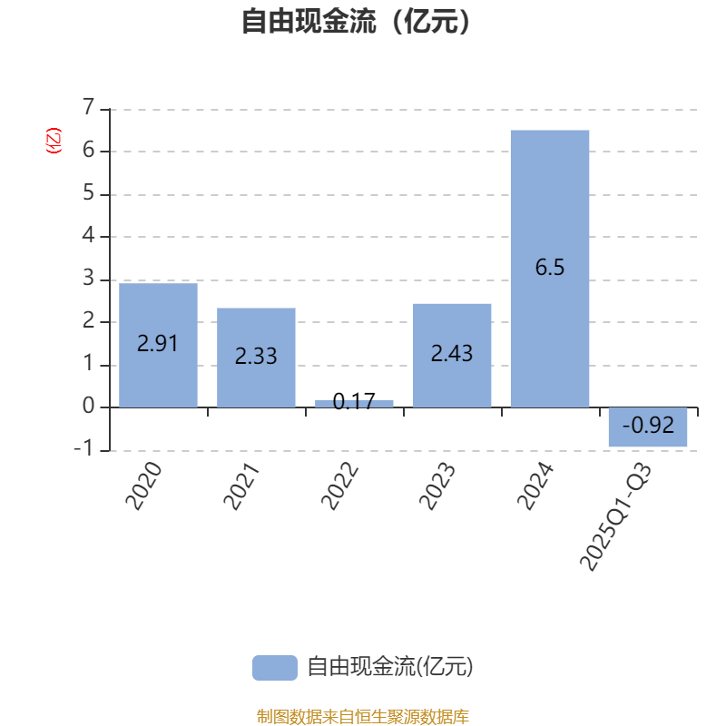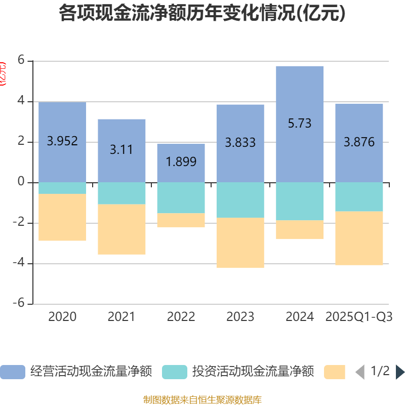 2025年前三季度,公司经营活动现金流净额为3.88亿元,同比下降44.14%;筹资活动现金流净额-2.65亿元,同比减少3.05亿元;投资活动现金流净额-1.44亿元,上年同期为-1.44亿元。