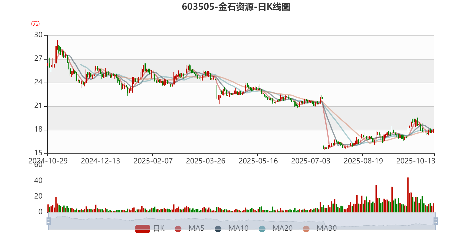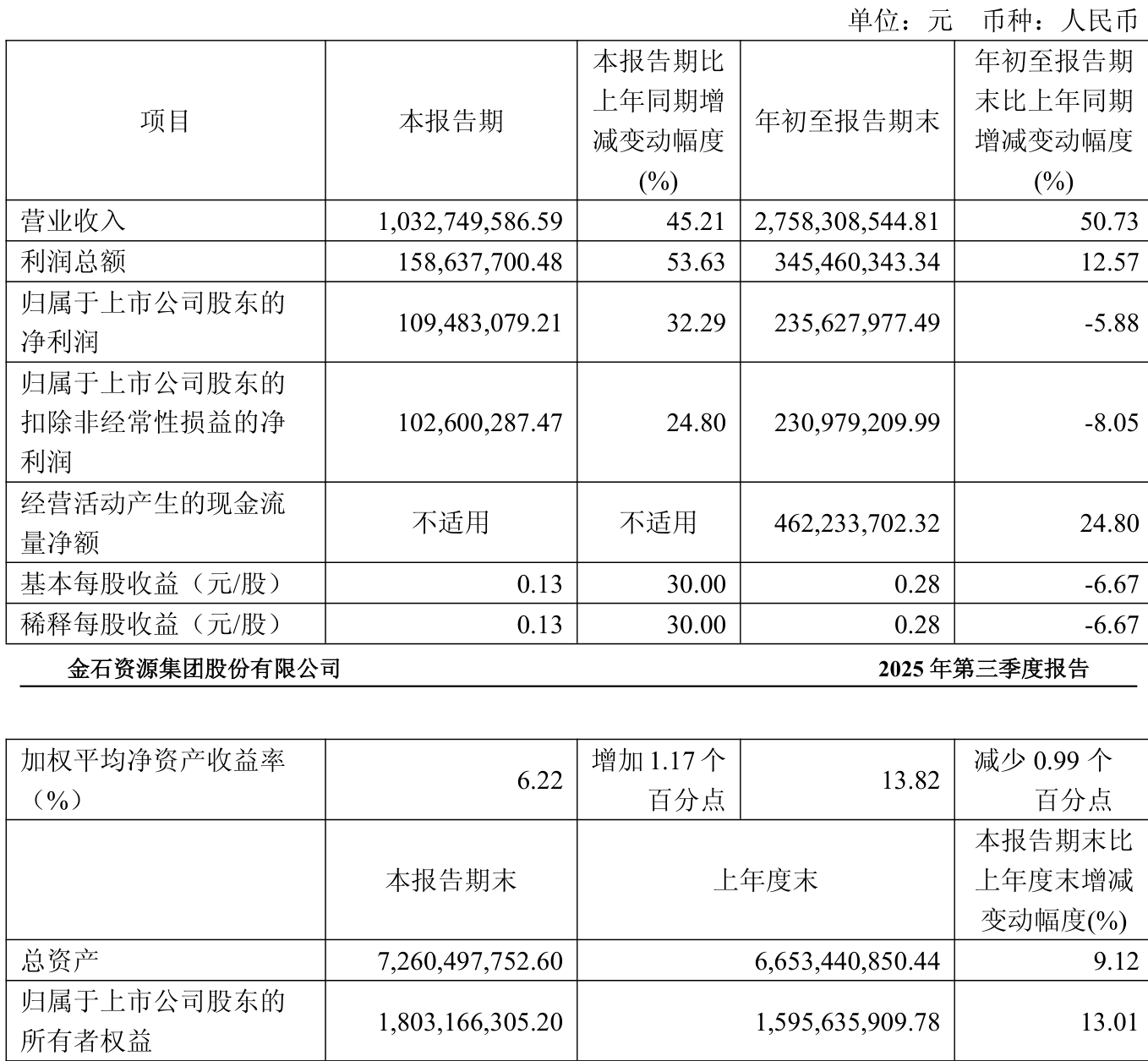 中证智能财讯金石资源(603505)10月29日披露2025年第三季度报告。前三季度公司实现营业总收入27.58亿元,同比增长50.73%;归母净利润2.36亿元,同比下降5.88%;扣非净利润2.31亿元,同比下降8.05%;经营活动产生的现金流量净额为4.62亿元,同比增长24.80%;报告期内,金石资源基本每股收益为0.28元,加权平均净资产收益率为13.82%。