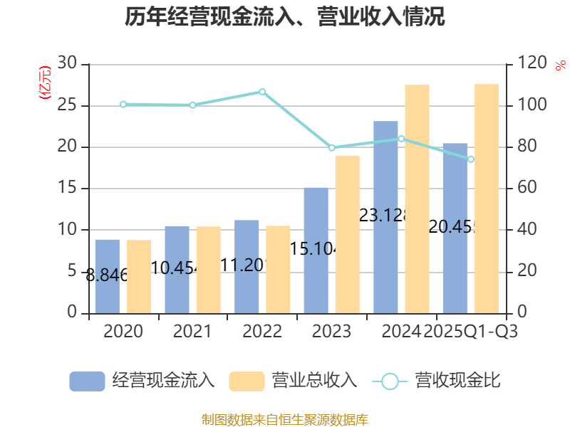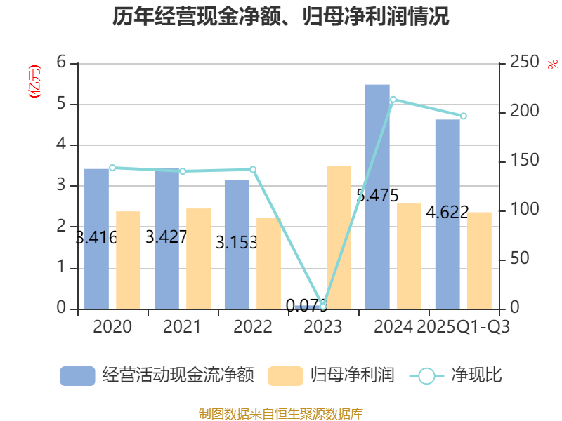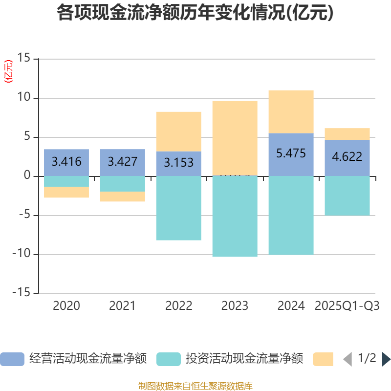 2025年前三季度,公司经营活动现金流净额为4.62亿元,同比增长24.8%;筹资活动现金流净额1.49亿元,同比减少4.04亿元;投资活动现金流净额-5.05亿元,上年同期为-7.47亿元。