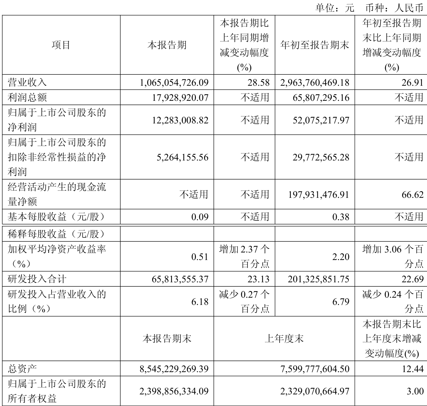 中证智能财讯巨一科技(688162)10月29日披露2025年第三季度报告。前三季度公司实现营业总收入29.64亿元,同比增长26.91%;归母净利润5207.52万元,同比扭亏;扣非净利润2977.26万元,同比扭亏;经营活动产生的现金流量净额为1.98亿元,同比增长66.62%;报告期内,巨一科技基本每股收益为0.38元,加权平均净资产收益率为2.20%。