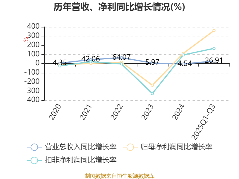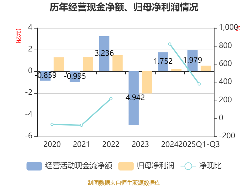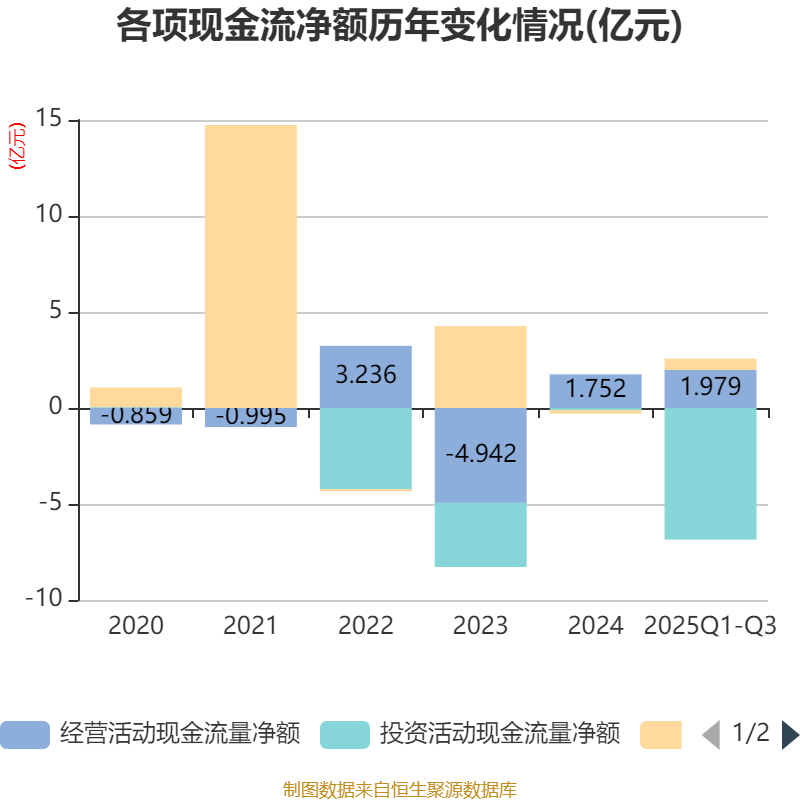 2025年前三季度,公司经营活动现金流净额为1.98亿元,同比增长66.62%;筹资活动现金流净额5893.32万元,同比增加1.43亿元;投资活动现金流净额-6.85亿元,上年同期为-4.31亿元。