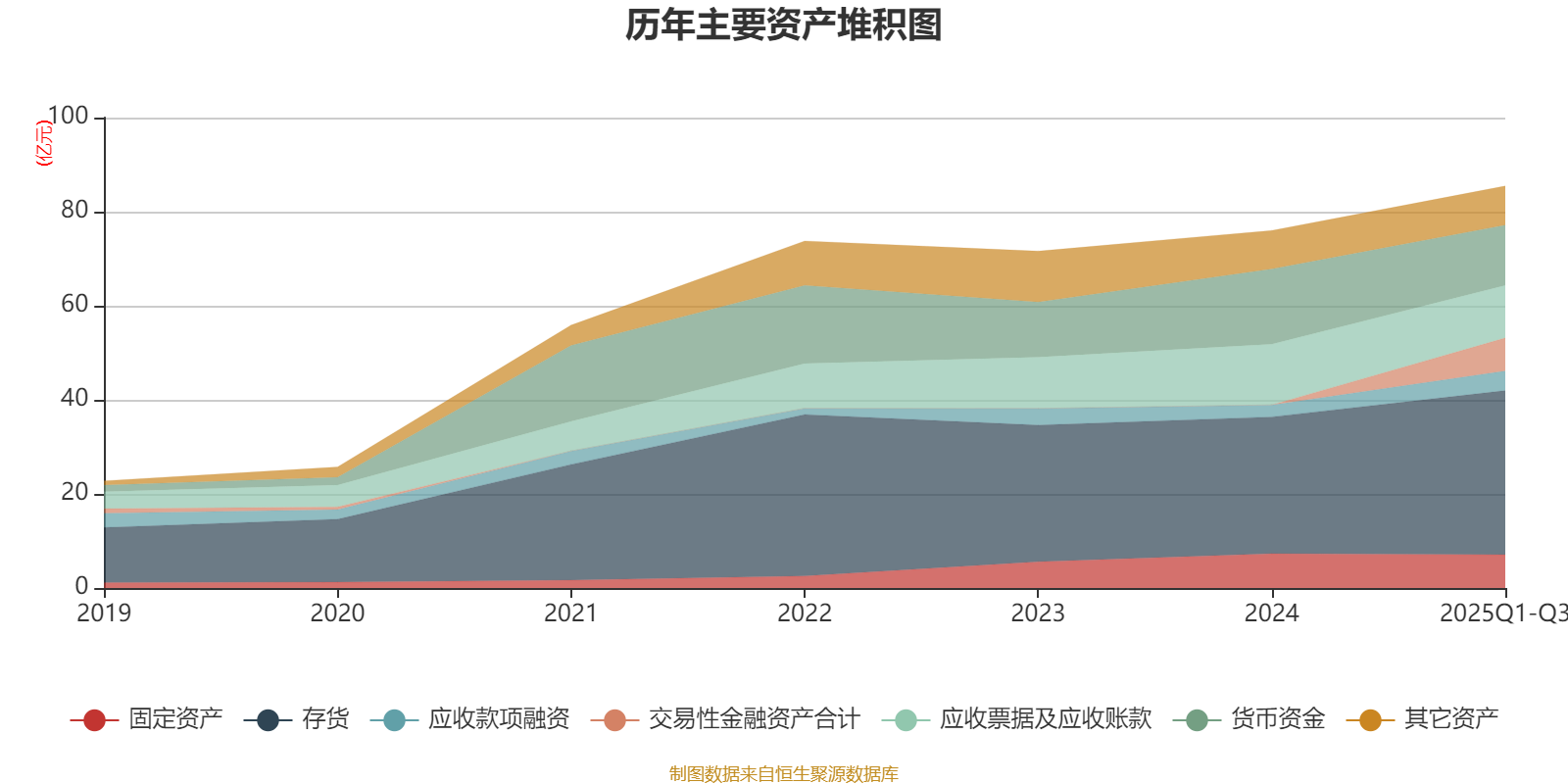 资产重大变化方面,截至2025年三季度末,公司交易性金融资产合计较上年末增加630579.88%,占公司总资产比重上升8.22个百分点;货币资金较上年末减少19.76%,占公司总资产比重下降6.02个百分点;应收票据及应收账款较上年末减少13.44%,占公司总资产比重下降3.91个百分点;存货较上年末增加20.02%,占公司总资产比重上升2.58个百分点。