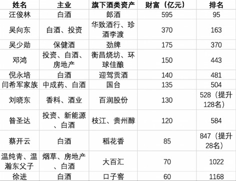 华致酒行、珍酒李渡实控人吴向东以370亿元财富排名第163,据了解,受今年上半年白酒深度调整期等影响,华致酒行与珍酒李渡收入均出现“腰斩”,不过从企业市值来看,华致酒行和珍酒李渡截至9月1日,并未出现较大幅度的下跌,因此吴向东比去年下降6名。
